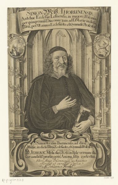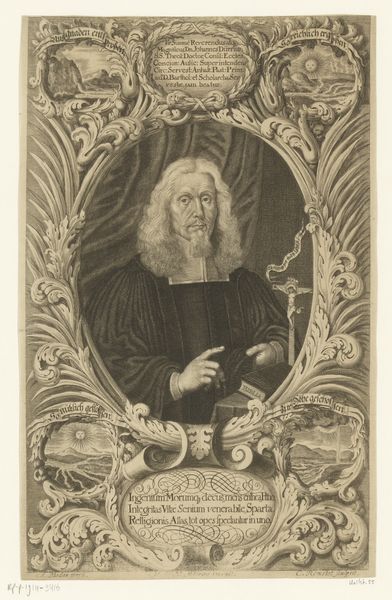 Christian Romstet created this portrait of Johannes Olearius using engraving techniques. It shows a man holding a book, positioned as if he is standing at the entrance to a long hallway. The use of linear perspective is really striking here. The building stretches into the distance, inviting the eye to travel deep into the composition. The exterior is subtly suggested by a landscape with trees along the hall. The man stands at the forefront, his figure rendered with detail that contrasts against the ethereal background. The architectural elements around him are more than just backdrops; they create a sense of depth, but the space is almost dreamlike. Romstet challenges our understanding of space. He's not just showing a man in a place, but creating a dialogue between knowledge and environment, between the known and the infinite, all through the careful arrangement of lines and forms.