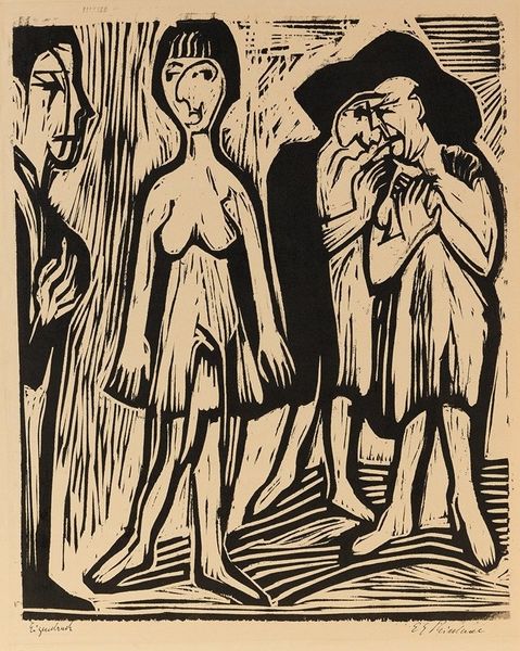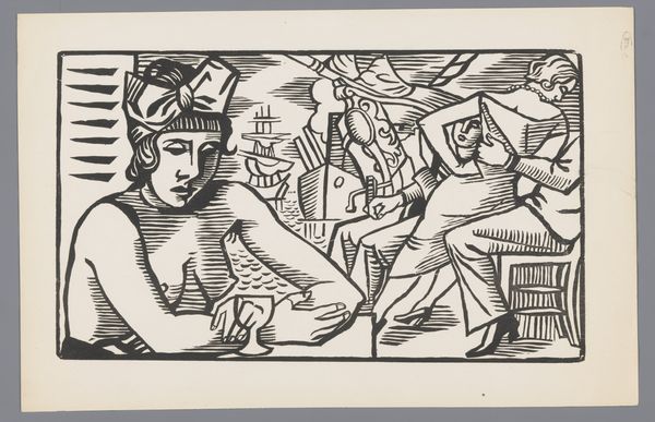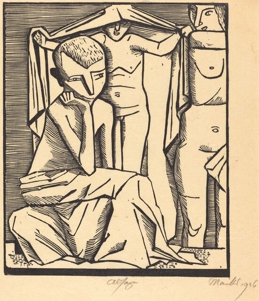 Editor: Here we have Mikuláš Galanda’s "Slovak Family," created in 1929 using ink on paper. It's quite striking, a rather somber scene rendered in sharp, angular lines. What do you make of it? Curator: Oh, it sings to me of hearth and hardship! Notice how Galanda bends realism with expressionist yearning, all in stark monochrome. The figures are both present and symbolic – mother, father, the suggestion of new life, bound together, yes, but also somewhat isolated within their own spaces. Does the stark contrast evoke anything in you? Editor: I hadn't thought of the isolation, but I see it now! There's almost a sense of...resignation in the woman’s posture, contrasted with the father, seemingly preoccupied. And what's with the chicken? Curator: Ah, the chicken! Rural realism, yes, but maybe something more. A symbol, perhaps, of domesticity or even a touch of sacrifice. Galanda’s Slovakia was wrestling with identity, and this image feels like a tender, slightly painful, appraisal. Doesn’t it make you wonder about their everyday life, the weight they carry? Editor: It definitely does. The way you connect the personal to the broader cultural context is fascinating. I see so much more in this now than I did initially. Curator: And that, my friend, is the magic of art. It holds a mirror up to the world, and in that reflection, we glimpse ourselves. What a wonderfully moody family snapshot—it really grabs your attention, doesn't it? Editor: Absolutely, thank you! I am leaving this audio guide a lot more enlightened than when I first walked up.