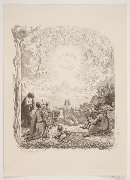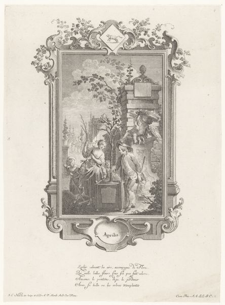 Wilhelmus Petrus van Geldorp created this artwork, "Tuinierend gezelschap," as an ornamental design sometime in the 19th century. The detailed drawing depicts a family tending to their garden. In the mid-1800s, the Netherlands saw significant social and economic changes, with shifts from agrarian to more industrial economies. Geldorp's rendering of the family might romanticize rural life in the face of these changes, reflecting a desire to preserve certain traditions. Note the clear distinctions in labor and roles portrayed. The men are actively working the land, while the woman stands with the children, watching. These gendered divisions of labor were typical and suggest the artist's acceptance of traditional social structures. The detailed rendering of the garden, framed by an elaborate ornamental design, perhaps points to the artist’s investment in portraying an idealized, well-ordered world. The image evokes a sense of nostalgia, and presents a carefully constructed tableau of family and labor.