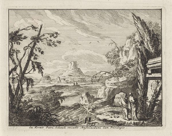 Editor: This detailed etching is entitled "Landscape With a Wooden Bridge" by Raphael Sadeler the Elder. The light and shadow create this sense of drama. What’s your read on this piece? Curator: It reminds me of a stage set, doesn’t it? This meticulous detail, almost theatrical. The bridge, those tiny figures, a beckoning journey. It's a landscape, but with a story bubbling underneath. What do you feel it evokes? Editor: A sense of adventure, maybe? I hadn't thought of it as theatrical, but I see that now. Curator: Yes, and the adventure seems internal, reflected in the landscape itself. It's quite the journey into the self, isn't it? Editor: Absolutely, a new lens on landscapes!