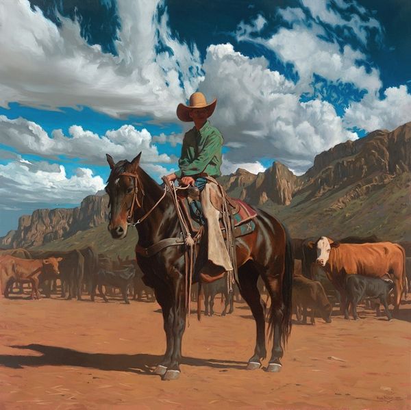Editor: We’re looking at Mark Maggiori’s "Johnny on the Range" from 2014, an oil painting. It strikes me with its stark beauty, the cowboy figure so still against a dynamic, almost theatrical sky. What do you see in this piece? Curator: Formally, the painting operates on contrasting diagonals. The strong diagonal of the land draws our eyes towards the horizon. Notice the rider; Maggiori uses the formal properties of line and shape to guide our vision, employing a precise vanishing point that creates depth and perspective. Editor: So it’s the arrangement that dictates the mood, rather than just the subject matter? Curator: Precisely. Consider how the color palette functions. Earthy tones in the foreground anchor the scene. The artist subtly disrupts this harmony with cooler hues in the upper portion. Do you see how that push and pull adds a layer of complexity? Editor: Yes, it stops it from being a simple, pretty picture. The balance of light and shadow too… Curator: Absolutely, the chiaroscuro lends drama. The darker tones serve to isolate the figure, drawing emphasis on its lines. Editor: I see, so the artist isn’t just depicting a scene, they're carefully controlling how we perceive it, like constructing an argument? Curator: An excellent observation. Maggiori employs the canvas as a stage, directing our gaze through form and composition. The visual cues give it power. Editor: That gives me a completely different perspective. I was stuck on the cowboy, but now I see how the whole piece works together formally. Curator: Indeed, the artist's mastery lies in orchestrating these elements into a cohesive whole, transcending the subject to evoke something truly profound.