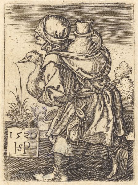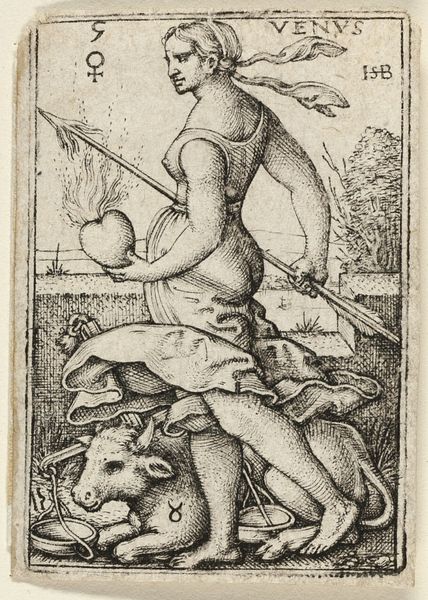 Sebald Beham created this engraving, titled "Venus," during the vibrant, yet turbulent period of the German Renaissance. Beham was one of the "Little Masters," a group of German printmakers known for their small-scale, intricate engravings. Venus, the goddess of love, stands here with a burning heart in one hand and a spear in the other, treading upon the zodiacal sign for Taurus. The image encapsulates the complex negotiations of gender roles and the cultural anxieties of the time. Venus, often portrayed as a symbol of ideal beauty, is armed, perhaps representing a more assertive, powerful female figure. This portrayal diverges from traditional representations, hinting at changing perceptions of women's roles. The burning heart and the symbol of Taurus further complicate the narrative. The heart, a universal symbol of love, is aflame, suggesting both passion and the potential for destruction. Consider how Beham uses classical mythology to develop a story that challenges and complicates the viewers expectations.