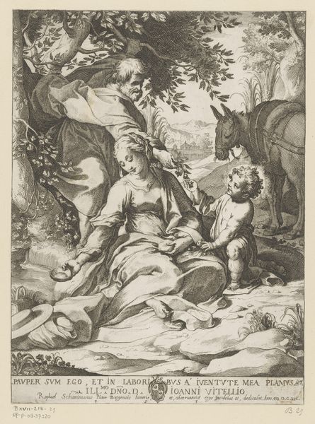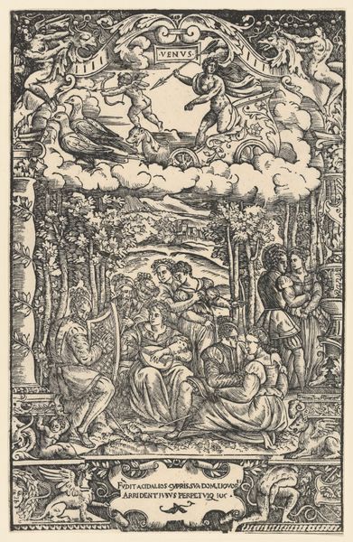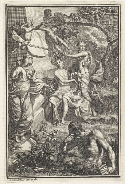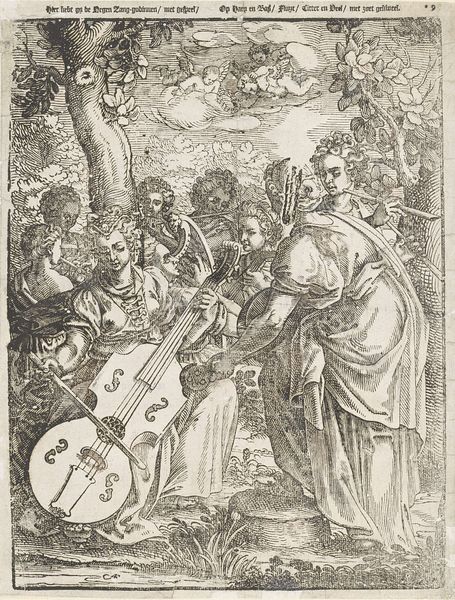 Hendrick Hondius I created this engraving, *Concert of the Muses on Parnassus*, which now resides in the Rijksmuseum, presenting us with a scene teeming with artistic allegory. The composition is arranged as a tableau, with the muses grouped in a grove, instruments in hand, evoking a sense of harmonious order. The meticulous lines, characteristic of Hondius's engraving technique, create a rich tapestry of textures and tones. The muses are not just figures in a landscape; they are embodiments of artistic expression. The central placement of the cello directs our attention to the act of creation, further emphasized by the structured arrangement of the muses, each contributing a unique element to the ensemble. Consider how Hondius uses the structured medium of engraving to construct a scene that’s not just visually appealing but intellectually stimulating. The engraving serves as a visual semiotic system, where each element—instrument, muse, and setting—contributes to a broader dialogue about art, culture, and the pursuit of knowledge.