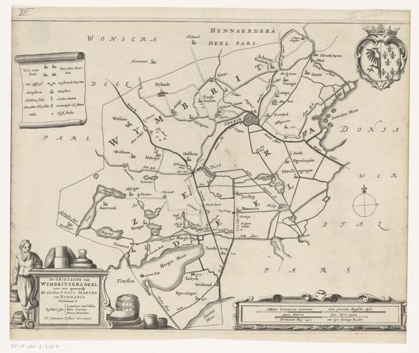 Curator: Here we have "Kaart van de grietenij Franekeradeel," a map created in 1664 by Jacob van Meurs. It's an ink and pen drawing, further realized as an engraving, now held at the Rijksmuseum. Editor: My initial feeling? A sense of contained curiosity. The fine lines, like delicate threads, weave together a world unseen. There's an air of both precision and possibility in this baroque sketch. It invites me to wander...but from above, you know? Detached. Curator: It's a fascinating artifact. The baroque style lends itself well to cartography, don't you think? Consider the cultural weight embedded within maps: power, ownership, and identity, all delineated with meticulous detail. Editor: Absolutely! It’s about control, literally drawing lines in the sand...or on the land. Look at the flourished cartouches, so ornate. But, at the same time, the very act of mapping is such a human, imperfect quest. It's imposing order on chaos, our chaos! Curator: The symbols chosen also speak volumes. That ornate crest, the compass rose, even the calligraphic script. They establish a visual language connecting the viewer to the depicted territory on many different levels of understanding. This connects to much older ways of visually interpreting landscape as well. Editor: Visual language indeed! This isn't just geography; it's a statement. Each carefully etched line screams, "We know this place, we claim this place". I bet there's some serious political intent behind those decorative borders! Maps back then were hardly neutral records, were they? Curator: Hardly. And notice the negative space? How the ink almost breathes on the page? It hints at the untamed, the "unmapped." And perhaps, fear, as much as it proclaims dominance and familiarity, as you've pointed out. Editor: That tension! A celebration of what's known, with the unsettling shadow of the unknown lurking just beyond. It is gorgeous. It makes you want to fill those spaces, to rewrite parts of that landscape. I hadn't noticed all that initially! Curator: Precisely. What began as a simple visual record becomes an exercise in cultural archaeology. Editor: Leaving me with a slightly unsettling curiosity, a mix of admiration, and perhaps a bit of rebellion...against the very notion of drawing lines on a land.