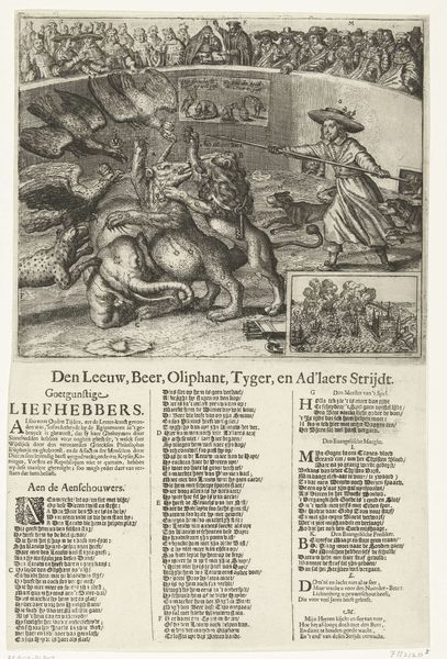 Curator: This engraving, dating back to around 1659, is titled "Allegory on the Northern War," made by an anonymous artist. It’s part of the Rijksmuseum's collection. Editor: It's wonderfully bizarre! An elephant, a bear, a lion... they're all locked in this grotesque, symbolic battle, overseen by what appears to be a very fashionable gent with a spear! It’s utterly arresting and unsettling at the same time. Curator: What’s particularly interesting here is how this piece comments on the political turmoil of the time. The Northern War involved shifting alliances between Sweden, Poland, Russia, and others. The artist uses these animals, as well as eagles, as stand-ins for the various nations involved. Editor: So the lion might be Sweden, maybe? And the poor elephant getting a mauling represents…Poland? It's intriguing how artists used to translate current events into such surreal and often cryptic allegories. It’s almost comical! Curator: It's crucial to analyze the production of prints like these. Engravings allowed for the widespread dissemination of political messaging. We need to examine the artist's technical skill, their access to materials, and the market for such imagery at the time. Also consider who this message might have served! Editor: And there's something undeniably compelling in that very process itself. Thinking about some artist etching away at a metal plate to create this bizarre tableau. The amount of labor is literally etched into the final work itself! Curator: And the text beneath, though difficult to fully decipher without closer examination of primary sources, surely amplifies this political narrative. Print functioned as a visual language capable of complex, nuanced communication across social classes. Editor: It almost makes me wonder what modern conflicts might look like if translated into a bestiary today. Perhaps a standoff between a corporate penguin and a social media unicorn. Who is in the audience? Curator: Precisely, there is even another dimension in considering audience! Let’s not forget consumption practices. Editor: It’s curious to see how such detailed political arguments and sentiments found distribution through printed image and prose. I would definitely not overlook labor and materiality here either. It is great! Curator: Indeed, by considering this, along with context we have achieved an interesting perspective on production and the meaning that can arise from the combination of these factors. Editor: Yes, that approach has opened a channel into a world of long ago conflicts which continue in this arresting allegory and material practice today.