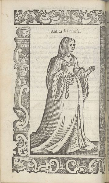 Editor: We’re looking at Christoph Krieger’s engraving from 1598, “Venetiaanse adellijke bruid, net na haar huwelijk,” or “Venetian Noble Bride, Just After Her Wedding.” It’s a print, depicting a woman in elaborate dress. I am really intrigued by the details and how ornate it is, given it’s just a print. What strikes you when you look at it? Curator: What immediately draws the eye is the masterful control of line and texture that Krieger exhibits. Consider how the varying densities of hatched lines are deployed to render the folds of the bride's gown, creating a palpable sense of volume and weight. Note, too, the intricate decorative border—a framing device that not only contains the figure, but also contributes to the overall aesthetic harmony. Do you perceive any dissonance, any area where the artist’s execution seems less assured? Editor: Perhaps in the rendering of her hands? They seem somewhat flat compared to the dynamism of the dress and the frame surrounding her. What is the role of text above her head? Curator: The inscription, "Spose sposate", serves to identify the figure and anchor her within a specific social and marital context. Furthermore, examine the interplay between the figure and the frame, how they echo one another formally. Notice how the bride's static pose creates a certain tension with the lively, almost frenetic energy of the surrounding ornamentation. It is in this tension, I believe, that we discover the engraving's expressive core. How does it influence the mood of this composition? Editor: It seems as though her still expression creates the focus that is contained by the more decorative frame around the figure. I found your attention to the line and volume helped me really look at the engraving in a way I had not initially. Thank you. Curator: My pleasure. Indeed, analyzing the elements creates a more thoughtful encounter and a deeper understanding of art.