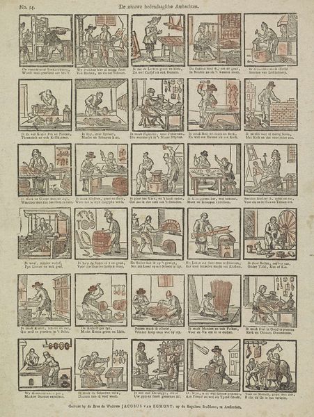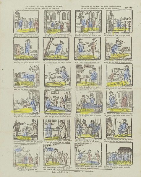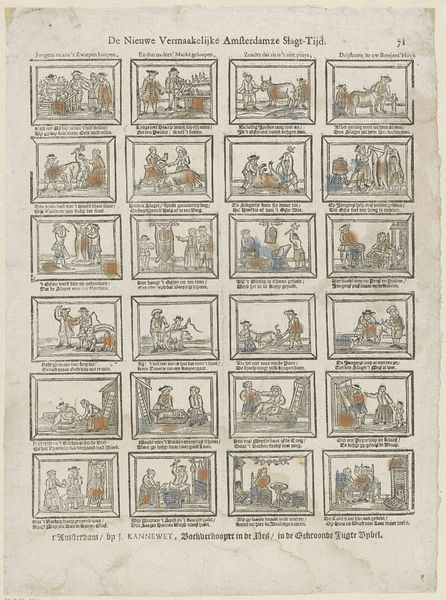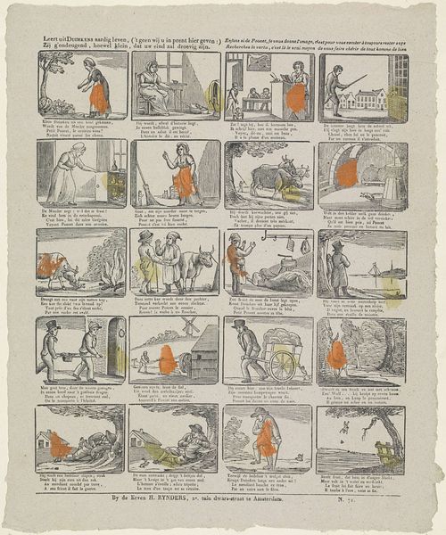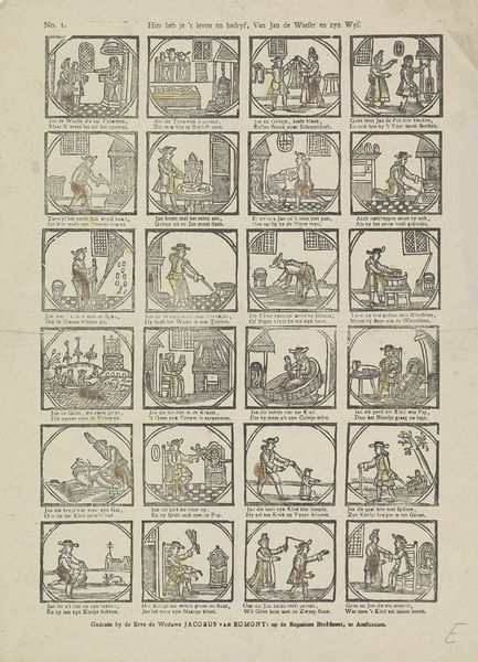 Curator: Here we have "Hier vindt de jeugd, tot haar gerijf, / Tijl Uilenspiegels snaaksch bedrijf" – an engraving by Mindermann & Co., sometime between 1822 and 1849. Look at how the narrative unfolds panel by panel, almost like a comic strip! Editor: Yes, it's charming! The paper looks so aged, and the scenes, while small, are full of energy. What strikes me is how mass-produced it appears. How does its being a print, and seemingly intended for a wide audience, affect how we should understand the work? Curator: Precisely! The means of production is key. This isn't some unique, precious painting; it's an engraving, created through labor, designed for reproduction and wide consumption. Consider the role of Mindermann & Co. – were they artists, publishers, or a combination? This suggests an early form of cultural industry. How do you think the availability of such prints shaped ideas about art and storytelling? Editor: I see your point! It moves away from this idea of a singular artistic genius and shifts focus to workshops, commerce, and a broader societal interaction with imagery. These weren’t precious objects. Curator: Exactly. It democratizes the narrative of Tyl Ulenspiegel – a folk hero, in a time before movies and widespread literacy. The engraving’s cheapness allowed stories to be consumed by almost everyone. What impact does that have? Editor: So the value lies not only in the image itself but in the whole production and consumption cycle and what it signifies within 19th-century society... the industrial element! Fascinating! Curator: Indeed. Considering art as a product, reveals so much about social relations. Now, how might the scenes depicted relate to the lives of the people consuming these images? Editor: That’s a great question – gives me something to consider on my next visit to the Rijksmuseum!
