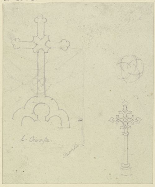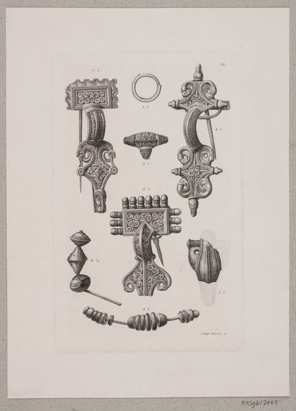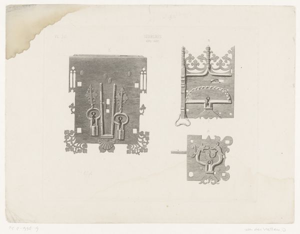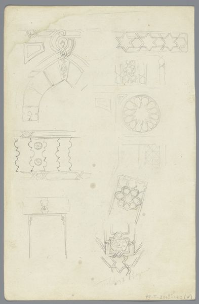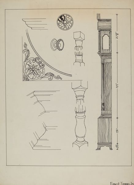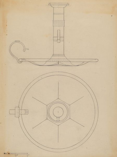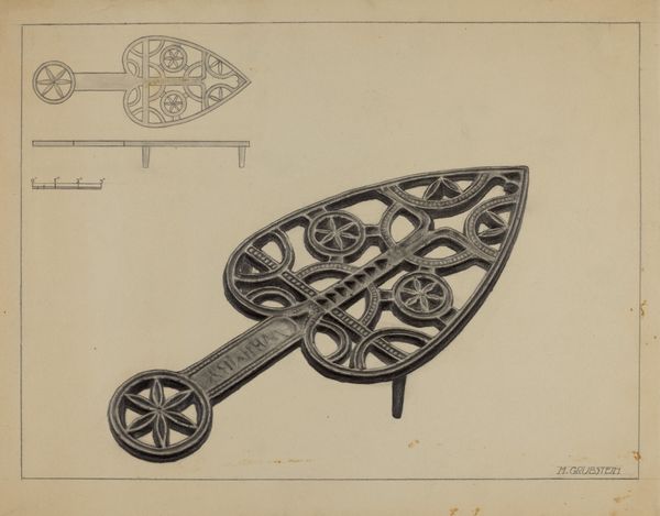 Curator: What we have here is Marie Famularo's "Lamp Bracket," a pencil sketch created in 1937. It's interesting, capturing both functional design and intricate detailing in what appears to be a study or perhaps a proposal. Editor: Immediately, the precision strikes me. It's not just a drawing; it's a vision of elegance, almost ornamental, contrasted against the utilitarian nature of, well, a lamp bracket. It evokes an interesting dialogue about class and domestic aesthetics in the late 1930s. Curator: Exactly. Looking at the rendering style, with its light pencil work and toned paper, one gets the feeling this piece was part of an industrial design education initiative of some kind. Such precision was required to have a design prototyped and mass produced. The degree of embellishment would need to be carefully costed in any production plan. Editor: It also highlights the aspirations of the everyday, doesn't it? To embed beauty into the functional, and therefore make beauty accessible. Yet, one wonders who was intended to enjoy this beauty? Were these brackets destined for wealthier homes, perpetuating inequalities through design itself? Or were they conceived as a means to elevate the living spaces of the working class? Curator: Those are vital questions to consider when contextualizing design of the era. We need to recognize, also, the influence of the Arts and Crafts movement in the creation of works such as this, though this may be a more streamlined version than that movement might advocate. The designs integrate floral and geometric forms—that's key. How is nature idealized, controlled, presented within domestic space? What impact does it have on the social role of that space? Editor: I think its value extends beyond pure functionality, especially given today’s context, more than 80 years on. It's about aspirational symbolism, about investing dignity into the domestic sphere for the people who were tasked with managing and caring for it. Who were likely to be working-class women. A quiet rebellion, perhaps, against the starkness often associated with functional design. Curator: It's fascinating to trace how these sketches operate within a broader landscape of design history and social commentary. Editor: Indeed. Examining art objects like this helps us understand how the mundane items we take for granted were, and still are, subject to intricate social and political forces. Thanks to Famularo's piece, we get to re-imagine such hidden systems of knowledge.