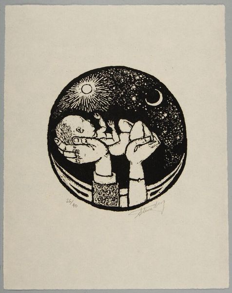 Editor: Hilda Katz's print, "Spinning Top," well, it’s just so bizarre! The black and white contrast is really stark, and it feels almost dreamlike. What do you make of it? Curator: Dreamlike is a good word! It feels like a memory, distorted and simplified. The spinning top, the little figures, the odd architecture – perhaps symbols of childhood games seen through an adult lens, a touch melancholy, no? I wonder, does it remind you of anything? Editor: A little like a fever dream. So you think it's autobiographical? Curator: Perhaps, but it’s also universal. Think about how fleeting childhood is! The spinning top wobbles, then falls...like time itself, always moving, always changing. Editor: Wow, I hadn't considered that! Suddenly, it feels much more profound. Curator: Isn't it amazing how a simple image can hold so much? I see something new every time. Editor: Me too. Thanks!