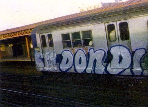 Here we see "Tracy 168 Wildstyle," a graffiti artwork by TRACY 168, painted directly onto a New York City subway car. The visual impact is immediate: bold lettering fills the frame, a flurry of stylized forms in white with blue outlining. Hearts and smaller tags add to the complexity of the composition. The artwork exemplifies "Wildstyle," a form characterized by its interwoven, complex structures that often border on illegibility. TRACY 168 uses the entire train car as his canvas, creating a dialogue between the static form of the train and the dynamic energy of his lettering. The overlapping and interlocking letters create a sense of depth and movement. "Wildstyle" challenges conventional notions of legibility and order. Instead, it presents a visual system where form takes precedence over straightforward communication. The overall effect is a dense tapestry of shapes and colors, inviting viewers to decode and interpret its complex structure. The artist engages with the semiotic system of signs, transforming the subway car into a moving canvas that challenges fixed meanings and celebrates the fluidity of urban expression.