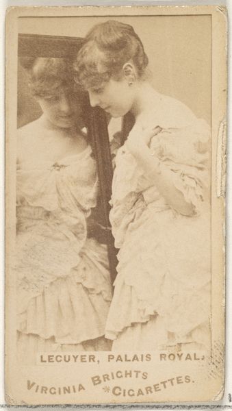 Editor: This is "Georgie Dennin and Sadie Kirby, Erminie Co.," a photographic print from 1889, part of the Actresses series by Wm. S. Kimball & Co. The sepia tone gives it such an antique feel, and it's interesting how posed it is, a far cry from today's casual photos. What jumps out at you when you see this piece? Curator: It's a fascinating example of the intersection of popular culture, celebrity, and consumerism in the late 19th century. Consider this: these weren't just portraits; they were trade cards. Tobacco companies, like Kimball, used them as promotional items. These actresses became publicly consumable images within a larger marketing strategy. Editor: So, it's not just about art, but about commerce? Curator: Precisely. Think about the societal role of actresses at the time. They were public figures, objects of both admiration and scrutiny. By including them in these cards, Kimball was capitalizing on their fame and associating it with his product. These cards made a statement about aspirations and luxury that the tobacco brand wanted to evoke. Who were these actresses appealing to? What do you know about the company's target audience at the time? Editor: Well, tobacco was pretty widespread, so maybe a general audience? But perhaps more men, since tobacco ads at that time... targeted that market. I hadn't considered how much context lies within what looks like a simple portrait. Curator: Absolutely. These images offer a snapshot of the period's cultural values. Moreover, consider where these cards ended up—in albums, scrapbooks. So they took on a different function in domestic settings and afforded actresses a form of extended social commentary on stage and within social circles. Editor: I see your point! It's like a form of early advertising using celebrity endorsements before that became widespread. This reframes how I viewed this photograph! Thanks. Curator: And I appreciate you identifying how posed it appears - perhaps an indicator about where we are heading now within today’s advertising trends. Thank you!