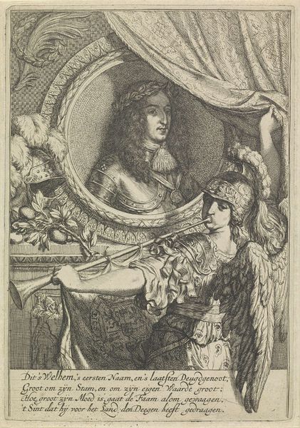 Curator: Standing here, I’m struck by the theatricality of this engraving. It’s entitled "Paar op een bordes, gekleed volgens de mode van 1680-'90," or "Couple on a platform, dressed in the fashion of 1680-90." Editor: Absolutely. My first impression is drama, but a kind of stylized, almost… melancholic drama. They're so meticulously dressed; it's a world of lace and powdered wigs, but their faces hint at something more going on beneath the surface. Curator: It was created by Jacob Gole, somewhere between 1680 and 1724. The medium is engraving, which was, of course, a very popular method for disseminating images widely at the time. This work captures the fashion and social attitudes of the late 17th century with remarkable precision. Editor: You can practically feel the stiffness of their clothes, the weight of societal expectation. Look at the woman’s pose; the sheet music she holds seems more like a prop than something she actually sings. Is she singing for joy or keeping up appearances? What songs would this fashionably overdressed lady sing anyway? Curator: I think that observation leads us to the complicated place of women within such visual structures: they serve primarily as decoration, though their representation here might critique such an ideology of luxury. Think how portraits were often commissioned not as simple mementos but also political statements, solidifying status. Editor: And how confining! Look at her veil, like a stylish cage! This portrait does seem a rather sober advertisement of finery. It’s really a reminder that portraits were, and perhaps always are, careful performances. Everyone involved seems painfully aware of the gazes they solicit. I can imagine what the price was to hold your sword as flawlessly as he does. Curator: Indeed. Engravings like these allowed access, albeit mediated, to a lifestyle largely out of reach for most. What stories were created as these prints made their way from the hands of elites to those of the growing middle classes? It speaks volumes to art's powerful influence in shaping our perception of the past and, by extension, ourselves. Editor: Yes, in the play of appearances and underlying emotions that Jacob Gole immortalizes in this detailed engraving. There’s something so revealing and hidden about this encounter. We see it all, but in a whisper.