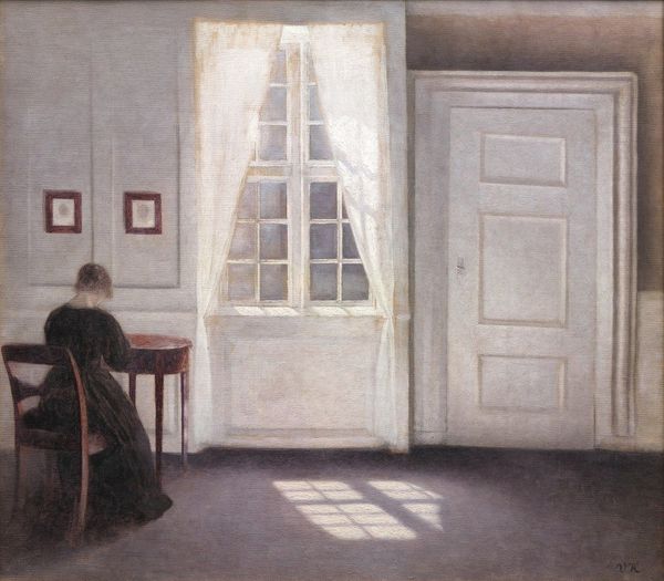 Curator: Ah, another glimpse into domestic stillness. We are looking at a painting titled “Interior” by Carl Holsøe. Editor: You know, right away, I get this feeling of quiet observation, like we’re peeking into a hushed space where someone’s lost in thought. There's a lone figure in another room, framed by the doorway and bright light. Curator: The painting offers a subtle commentary on the roles of women in the late 19th century. Confined in domestic space, separated from any opportunity of public engagement. You see how this creates a subtle critique of bourgeois values and the limitations imposed on women's lives, right? Editor: Absolutely. It's that separation – physical and perhaps metaphorical – that really strikes me. She is framed there as an artwork to observe, don’t you think? She might as well be a figure trapped inside one of the dark frames behind the chair. The heavy furniture adds to the feeling of enclosure, maybe even oppression. Curator: And let's consider how this artwork participates in the tradition of interior genre painting. The arrangement of the objects and light work to articulate notions of privacy, gender, and class, that serve as the historical milieu for female oppression. Editor: Well, looking closer, you can feel the softness in the light. And you can even see brushstrokes – that telltale sign of oil on canvas that reminds you there's a real person behind the work. And it suggests a moment, a single breath held in paint. It’s like he's saying, 'Look, even in stillness, there’s so much life'. Curator: Precisely. Through composition, Holsøe encourages viewers to reflect on the interplay between the domestic and the societal expectations imposed on the figure portrayed. The choice of somber colours and enclosed spaces also suggests broader themes related to power, control, and gender roles. Editor: I think you’re spot on. Now I want to grab a book, sink into a chair and let the quiet surround me like in that room. What do you think about this? Curator: This analysis highlights art’s function as a visual platform to instigate dialogue, even activism. It shows us the painting extends beyond its aesthetic surface. Editor: You're right. Seeing it this way, I appreciate the painting even more. Thanks for guiding me on that one.