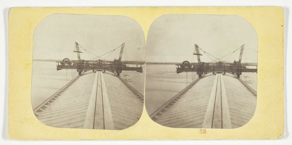 Curator: This gelatin-silver print, titled "Man stands on the ice at Entrepotdok," was captured by Pieter Oosterhuis in 1859. Editor: There's an undeniable stillness in this photograph, a hushed silence clinging to the sepia tones. Curator: The composition leads the eye to the details, from the frozen canal to the rigid geometry of the bridge, revealing the structures in this urban landscape. The tonal values define form here. Editor: I find myself drawn to the man. His presence gives a human scale to the sheer materiality of this setting: ice underfoot, stone structures, all constructed through manual effort. Curator: Notice how Oosterhuis uses the bridge's architectural lines to dissect the frame, creating visual tension between the built environment and the natural landscape. It provides an organizational principle that reinforces this spatial relationship, as seen through this photographic medium. Editor: It makes you wonder about the conditions faced by those constructing the docks or navigating the icy waterways—what kind of labor and innovation did these scenes rely upon. Photography was also innovative here. Curator: I appreciate how Oosterhuis carefully balances shadow and light in the architecture to expose surface materiality; it allows viewers to read subtle nuances through light manipulation alone, something we observe particularly well with the building behind the canal. Editor: Seeing how early photography recorded the city prompts a reflection about visibility, access, and class, who had the luxury to have their portrait taken, and how this informed narratives around work and urban life. Curator: Indeed, looking closely into how structure is captured here and analyzed formally, there is the element of spatial context, not just documentary context; Oosterhuis brings the viewer into a relationship, a visual negotiation of elements of design. Editor: And I keep wondering about that individual and the material culture that has produced his attire, tools, and that whole world on ice. Fascinating to have viewed these elements, each from a different lens!