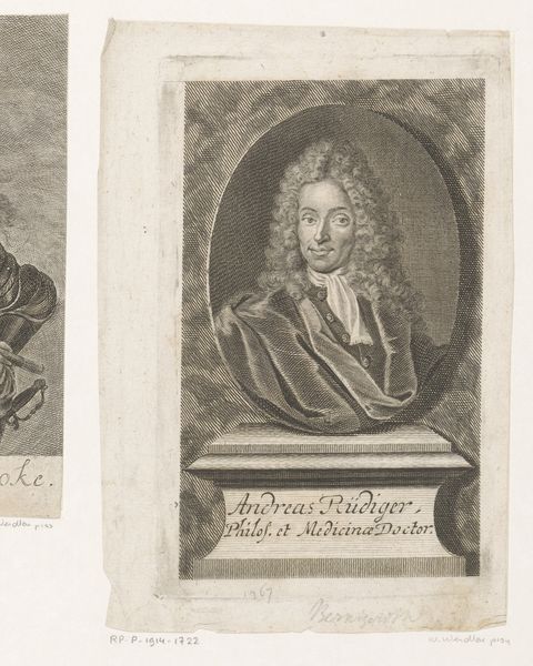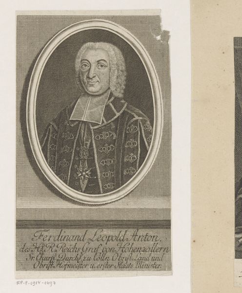 Curator: Here we have Martin Bernigeroth's portrait of Pierre de Villiers, likely created between 1680 and 1733. It's an engraving, currently held here at the Rijksmuseum. Editor: It strikes me as quite rigid. The starkness of the lines, the formalized pose. A little severe, almost? Curator: Baroque portraiture often leans into the hierarchical representation of the sitter. Look at how Bernigeroth employs line to create the texture of the fabric; observe how the oval cartouche both confines and elevates de Villiers. The composition centers on de Villiers, Prieur de St. Taurin dugrand Ordre des S. Benoist. Editor: You're right, that controlled composition communicates power. The meticulous details of his garments, even the lettering below... It’s not just an image; it’s a declaration. And what about the choice to frame him within an oval? Is it about containing his presence or emphasizing it? Curator: An interesting point. I see the oval functioning as a means of isolating the figure, almost lifting him out of his immediate context. This adds to the sense of importance, doesn't it? Note too, how Bernigeroth makes use of background gridlines to both center de Villiers and keep the sitter in balance with the dimensions of the portrait itself. Editor: And this presentation – the portrait itself mounted on what looks like a small pedestal complete with his name – really emphasizes how it's intended for public consumption, a visual reminder of his authority. We have a powerful church leader memorialized here, made enduring. Curator: Indeed. Considering the function of portraiture in that era, it would serve to amplify his importance. Bernigeroth has left us with a structured view into that world. Editor: I'm walking away feeling more attuned to how power and imagery were intertwined then. Curator: Exactly, the lasting legacy of this Baroque print lies not just in its subject but in its demonstration of formal artistic codes of its time.