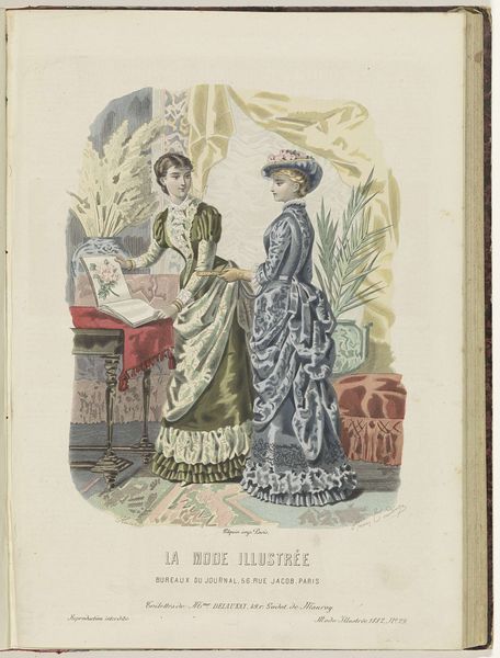 Jean-Baptiste Réville created this print, "Le Moniteur de la Mode," in 1846, capturing the styles of Parisian fashion. Here, we observe two women adorned in the height of elegance, standing beside a table displaying fashionable accessories. The parasol, casually held by the figure on the right, serves as more than a mere shield from the sun; it speaks volumes about the era's ideals of femininity. The delicate lace and ribbon embellishments on their dresses echo symbols of status, and refinement reminiscent of earlier eras. Consider, for instance, how the parasol is echoed by the classical Roman umbraculum, itself an emblem of power and prestige. Here, though, its significance has been subtly transformed. The parasol has become a key tool in the performance of femininity, reflecting how symbols and gestures recur through time, shifting in significance, embodying a cultural memory that shapes our perception. This image, therefore, not only presents fashion, but also engages with our subconscious understanding of social roles, sparking a connection across centuries.