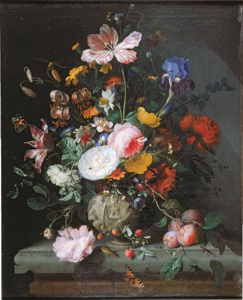 Peter Faes painted "Flowers by a Stone Vase" using oil on canvas, which you can see here at the Metropolitan Museum of Art. The artwork is a symphony of textures and forms that immediately draws the eye, contrasting the delicate petals of the flowers with the smooth, sculpted vase. This interplay creates a visual tension that animates the whole composition, offering a discourse on natural versus artificial, and fleeting beauty against enduring form. Arranged in a tight, pyramidal structure, each element—from the blooms to the bird’s nest—is meticulously placed to guide the viewer's gaze. Faes’ keen observation highlights the natural imperfections and unique character of each flower, and this realism challenges the more idealized depictions common in earlier still life. Through color and form, Faes invites a deeper reflection on the transience of life and the enduring presence of art. Observe how these carefully arranged components transform the painting into a meditation on time, beauty, and decay.