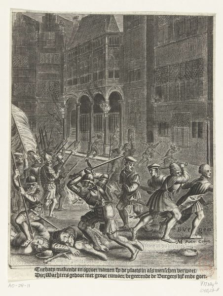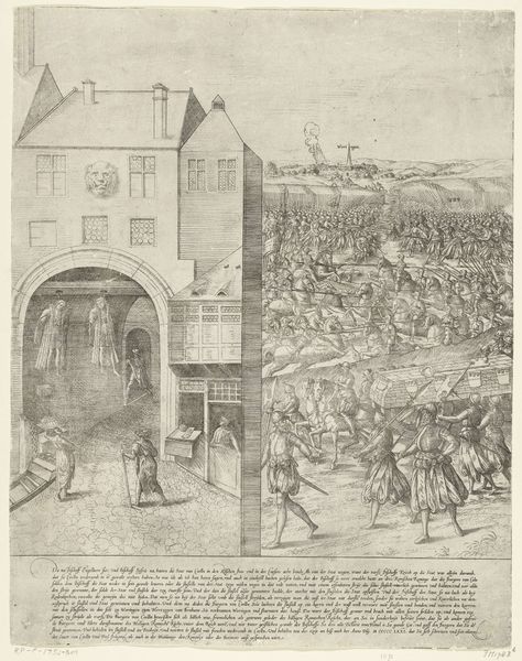 Editor: This engraving, titled "Aanval op de wederdopers in het stadhuis, 1535," made between 1612 and 1614, depicts a siege with a lot of spears pointed towards what looks like a governmental building. The scene feels chaotic, even ruthless. What can you tell me about this work? Curator: It’s a potent image, isn’t it? I see a deliberate staging of power, masked as historical record. This piece screams of the Baroque era and its grandiosity. It seems to represent more than just the siege of 1535, what do you think it says about power? Editor: Well, the overwhelming display of armed figures certainly suggests a clear power dynamic, with one group imposing its will on another, quite literally attacking. I'm not sure I would read a purely gendered message, but the attack on the state building clearly conveys the intent to undermine the existing political and societal structures. I am more interested in what may be driving such intolerance? Curator: Precisely! And it's crucial to ask, what narrative is being constructed? Is it a justification of authority through violence, or is it a critique? We need to consider how religion played a role in power structures, particularly the suppression and persecution of marginalized religious groups. The figures at the forefront embody, or challenge ideas surrounding authority, class, religion, race and privilege at the time. Editor: So, this piece, beyond illustrating a historical event, offers a glimpse into the anxieties and power dynamics of the 17th century through a depiction of an earlier event? Curator: Exactly. We should constantly ask, whose perspective is privileged here, and what message are they trying to spread, or perhaps what reaction might be sought? This piece invites us to reflect on the way historical events are represented to justify current attitudes to issues surrounding identity and otherness, and how that continues today. Editor: It's really helpful to think about the intent behind these kinds of historical depictions. Now, seeing it from this point of view makes me wonder how the image might serve to legitimize certain oppressive beliefs that existed then... and perhaps even continue today. Thank you for helping me contextualize this!