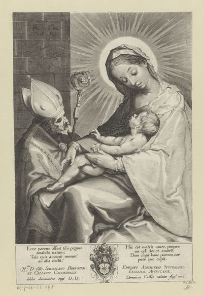 Jean Louis Roullet engraved this image of the Virgin Mary and child with a female saint during the latter half of the 17th century. Observe the reliquary held by the saint, its gleaming surface reflecting the light, drawing the infant Christ's attention. This motif of a holy figure presenting an object to the Christ child resonates through centuries. We might recall similar depictions in earlier Byzantine icons where saints proffer sacred texts or miniature models of churches, symbols of knowledge and faith. Yet, the reliquary here suggests something more tangible: a connection to the earthly remains of holy figures, grounding the divine in human experience. Consider how such imagery taps into our collective psyche, our innate desire to connect with the sacred through physical objects. This haptic engagement is a powerful psychological mechanism, allowing us to feel closer to the divine. Note how this symbol resurfaces, evolves, and takes on new meanings in different historical contexts.