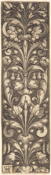 Curator: This engraving, "Panel with Candelabrum Containing Two Couples of Satyrs," was created in 1549 by Heinrich Aldegrever. What's your immediate take on this piece? Editor: I’m immediately struck by the detail; it's incredibly ornate! The dark hatching gives the figures weight but the material looks like paper and seems light despite the chaotic, fantastical energy. Curator: It's interesting you mention 'chaos,' given the symmetrical arrangement. Note how the composition hinges on the vertical axis of the candelabrum, framed by mirror-image satyr couples. The organization attempts to impose order, yet the figures undermine it with their unrestrained eroticism. Editor: Exactly! While the layout presents symmetry, look at the varying textures achieved only with lines: the smoothness of skin contrasting the roughness of the satyrs' goat legs! That requires immense labor! What about Aldegrever's access to fine metal plates? Were these images exclusive? Or circulated widely? It brings up questions of artistic license, craftsmanship and commodity. Curator: Such visual juxtapositions amplify the central theme—perhaps an allegory on base instinct. The controlled lines serve as a formal container barely restraining Dionysian revelry, as suggested by the creatures typically associated with the Greek god. Editor: The rampant sensuality suggests Aldegrever certainly wasn't afraid to engage with potent imagery, using his materials as a vessel for radical, erotic statements. But knowing this was a print raises the question: for whom? And where was it being displayed, consumed? Curator: Perhaps intended for a collector's cabinet or a private viewing, hinting at the emerging market for secular art among a discerning public during the Renaissance. Editor: I leave with a curiosity of labor; How long did each of these prints take, from concept to impression, and who all touched this small rectangle? Curator: I agree, I am left thinking about the dichotomy between structure and desire in this strange yet compelling composition.