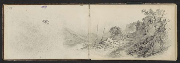 Editor: This is an untitled landscape sketch by Sir George Howland Beaumont, part of the Tate Collections. It's a small work, perhaps from a sketchbook. The materials look like graphite on paper. It has a stark, almost barren feel. What can you tell me about it? Curator: Beaumont was an important patron of the arts. Considering this, does this sketch reveal the labor of artistic creation, a process often obscured by the finished product in commissioned works? How does the materiality of graphite on paper impact our understanding of landscape as both subject and object? Editor: So, you're saying the sketch itself, the materials and the act of creating it, are as important as what it depicts? Curator: Precisely. It's about the means of production, the artist's hand, and how those things shape our experience. Editor: That's a really interesting way to look at it! I'll keep that in mind.