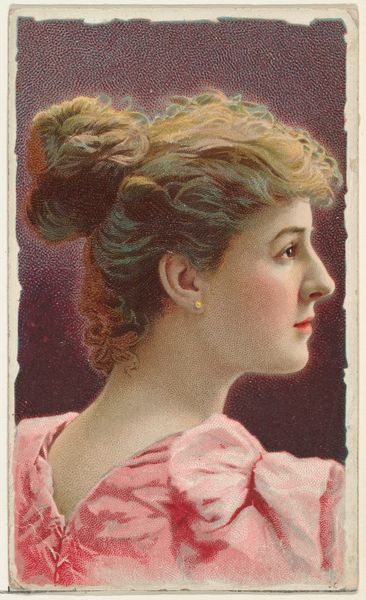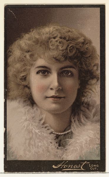 Curator: The woman in this portrait appears so ethereal, almost dreamlike with the muted colors, like she is illuminated from within. Editor: This card, dating from around 1891-92, comes from a series called “Stars of the Stage,” put out by W. Duke Sons & Co. It was essentially tobacco advertising, included in packages of Honest Long Cut Tobacco. Curator: Ah, it all becomes clear. That gives the image a completely different feeling – less about the actress, and more about... well, tobacco. So, mass-produced then? Not some artist painstakingly rendering her likeness? Editor: Exactly! These were churned out on a massive scale. Think about the process. Photography, then likely some sort of photomechanical reproduction, perhaps a chromolithograph, printed on cheap card stock, stuffed into tobacco packets... a real industrial endeavor to drive up sales of, in this case, "Honest" Long Cut. Curator: So this portrait, initially presenting the glamour of the stage, is really about production and the circulation of images and commodities. You see the image's purpose as less an aesthetic one, and more a…well, functional piece of advertisement meant to increase profits? Editor: Absolutely. While the image might initially strike us as an interesting artifact capturing a performer from that period, the context transforms it. How were these distributed? Who consumed them and where? What did owning such a card signify for people at that time? Curator: Still, there's something charming about it. It gives the feeling that the means of distribution almost do a disservice to this unnamed performer who gave her time to the endeavor. Editor: The tobacco companies certainly wielded their cultural and economic power! These cards were quite influential in shaping perceptions, from celebrity culture to beauty standards, within the landscape of commodity exchange and social practice. Curator: I see what you mean, how seemingly simple images are so indicative of broader trends, industries and economic shifts of a period. It makes one realize these are as indicative of that era as art pieces that are often taken at higher esteem. Editor: Precisely, challenging this traditional valuation reminds us of the complex networks through which images attain meaning and circulate in society.