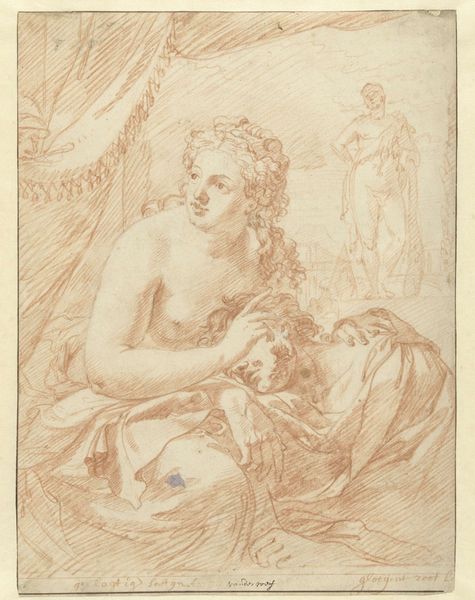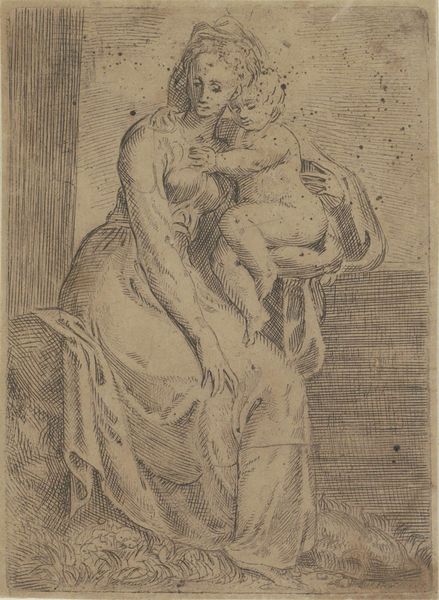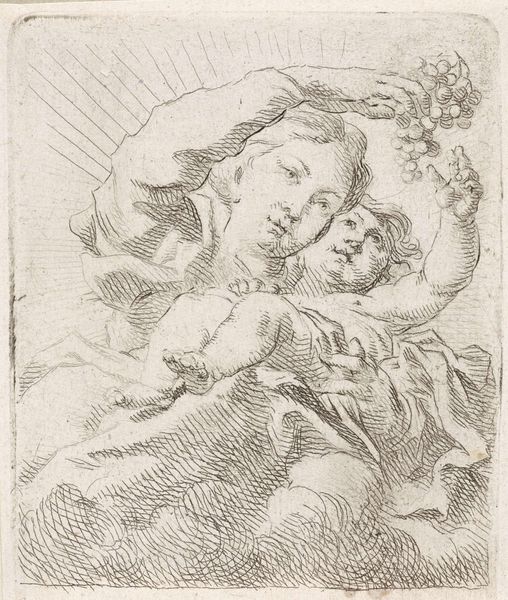 Simone Cantarini created this etching of the Holy Family in 17th-century Italy. At this time, the Catholic Church was a central institution, and art played a crucial role in conveying religious stories and moral values. In this image, we see Mary holding the infant Jesus, with Joseph lifting a curtain behind them. Cantarini uses delicate lines to create a sense of intimacy and tenderness, inviting viewers to connect with the sacred scene on a personal level. The family setting, with its subtle depiction of domesticity, reflects a broader cultural emphasis on the nuclear family and the roles of its members. The etching technique itself, with its capacity for detailed reproduction, was becoming increasingly important, allowing images like this to circulate widely. To understand this work more fully, we can turn to period documents, theological writings, and social histories. By exploring the world in which Cantarini lived and worked, we can appreciate how this small etching speaks volumes about the religious, social, and artistic values of its time.