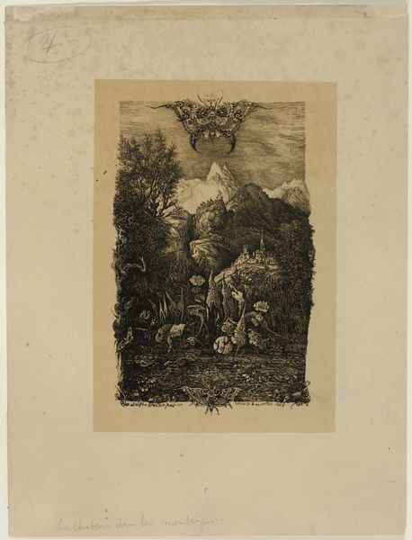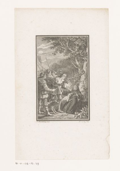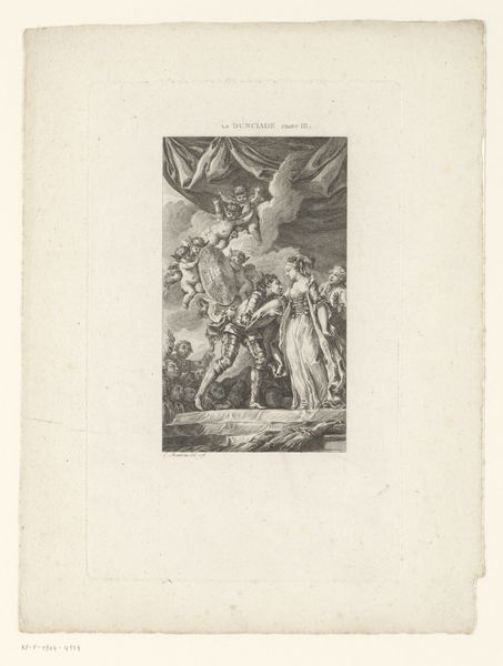 Editor: Here we have an engraving from the late 1700s titled "Scene from a Poem with a Woman Holding a Baby Upside Down Over a River". It’s by an anonymous artist and, frankly, the image is unsettling! What symbols stand out to you? Curator: Indeed. Beyond the immediately disturbing image of potential infanticide, we see echoes of sacrifice and impossible choices rendered across time and cultures. Note the woman’s bowed head; is that shame, resignation, or perhaps a tragic resolve? Editor: I hadn't thought of "sacrifice." What about the people in the background, the angel above—what part do they play? Curator: The chorus in the background intensifies the drama; they represent communal judgment, perhaps even societal pressures bearing down upon the woman. The angel could be interpreted as divine intervention, a symbol of hope or redemption, or maybe a representation of moral law. Ask yourself, what does it mean to depict this scene in the language of Romanticism, evoking raw emotion and a connection to the sublime power of nature? Editor: So the turbulent landscape reflects her internal conflict? The image definitely evokes strong emotions. It also makes me wonder about societal views of women and their agency at that time. Curator: Precisely. It invites a conversation about historical contexts, about desperate situations, and about the burdens of motherhood, shaped and interpreted through an artistic lens. What new connections can we draw between then and now? Editor: I guess art really does speak across the ages! Thank you. I definitely look at this piece differently now. Curator: And I am reminded how crucial it is to unpack assumptions, finding enduring resonance within unsettling imagery.