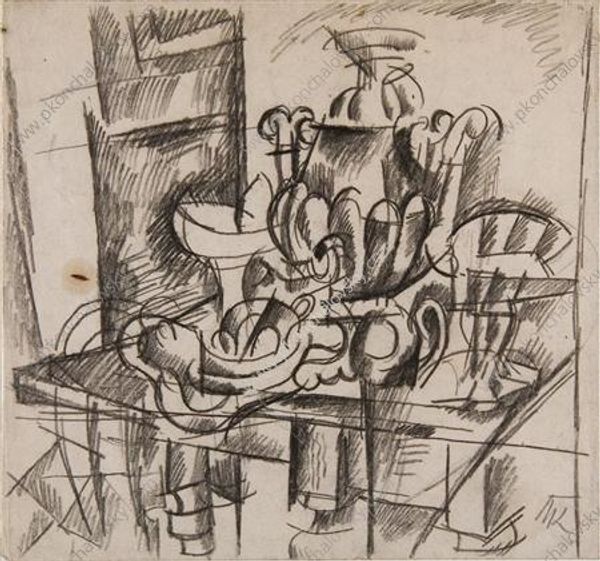 Pyotr Konchalovsky created this sketch of copper jugs with pencil on paper. Notice how the arrangement of objects creates a dynamic interplay between the outlined forms. The jugs, cups and bowls on the table are not just depicted; they are re-imagined as clusters of lines and shapes. Konchalovsky uses a rapid, almost frantic, network of lines to define the objects, which gives the still life an energetic, restless quality. This treatment of form aligns with early 20th-century Cubist principles, where objects are deconstructed and represented from multiple viewpoints simultaneously. The sketch flattens the three-dimensional space, emphasizing the two-dimensional surface of the paper, and the composition rejects traditional perspective. This destabilization of form and space challenges our conventional understanding of representation. The sketch becomes a field for exploring new ways of seeing. The very act of sketching, with its emphasis on process and exploration, becomes as important as the subject matter itself.