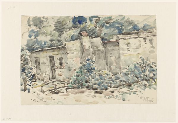 Editor: Here we have Johan Hendrik Weissenbruch's watercolor from between 1834 and 1903, titled "View of a Courtyard from the Artist's Studio on Kazernestraat in The Hague." It's quite understated, almost melancholic, in its depiction of everyday life. What strikes you about it? Curator: The watercolor medium is crucial here. Its inherent transparency and fluidity allow Weissenbruch to capture the transient quality of light and atmosphere. The rapid execution afforded by watercolor also suggests a certain immediacy, a capturing of a fleeting moment. How does this immediacy speak to the emerging industrial era, do you think? Editor: I hadn't considered the speed of execution in relation to industrialization, that's insightful! The sketch-like quality, then, could be seen as a counterpoint to mass-produced goods? Curator: Precisely. The deliberate choice of a humble, everyday scene, rendered in such a direct, almost utilitarian medium, can be viewed as a comment on the values of craft and individual experience against the rising tide of industrial standardization. Look at how the roughness of the brushstrokes and the visible paper grain challenge the idea of perfect representation. Editor: So it’s not just a picture of a courtyard, but also a subtle statement about the artist’s labor and values in a changing society? Curator: Absolutely. The very act of *making*, the materials used, and the conscious decisions about technique all point to a deeper engagement with the social and economic realities of the time. Consider the ready availability of watercolor versus the intensive labour needed for, say, oil painting; there’s an egalitarianism there. Editor: I’m beginning to see it differently now. I initially focused on the quiet mood, but the materiality and the production itself tells a story about art’s role in that era. Curator: Exactly. By focusing on the "how" and "what" of its making, rather than just the "what" it depicts, we unlock a far richer understanding.