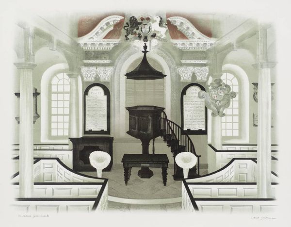 Curator: "Stairway Landing," an oil painting realized in 1969 by Lowell Nesbitt. The palette feels very restricted, cool, almost monochromatic. What’s your first impression? Editor: Haunting. There’s a stillness here, almost oppressive, amplified by that very limited, grey-toned palette. An almost photographic stillness with a dream-like quality that makes one feel not entirely present. Curator: I agree about the photographic feel; Nesbitt began as a photojournalist, a background that seems to permeate his visual choices. The painting seems like a snapshot lifted out of a film set of the era—sort of a film noir aesthetic. I see elements of realism combined with a symbolic arrangement of form and space. There's a window with gauzy curtains, a neoclassical bust...what do these signify to you? Editor: The classical bust juxtaposed with the sterile environment lends it the symbolic aura of mourning or memory. Notice that it presides over the railing in the near corner. But what of it? Curator: I think Nesbitt captured a mood so indicative of its historical context. It could almost be lifted straight from a play by Ibsen. What was the public’s fascination with such imagery at this moment in time? Editor: You are quite right. Considering the social unrest during that period, there seems to be a retreat here—perhaps even an avoidance of political confrontation—a sense of melancholy seeps from the canvas, resonating with the social anxieties of the time. And as we can discern from its place in this landing between the staircase, what this scene invites is merely to pass through. Curator: So maybe what we interpret is not only the psychological imprint of his personal reality, but one which is very of its own era as well. Editor: That's well said. This image and discussion is a fascinating microcosm for seeing that broader history, wouldn't you say? Curator: Indeed! Let's move on to our next exhibit.