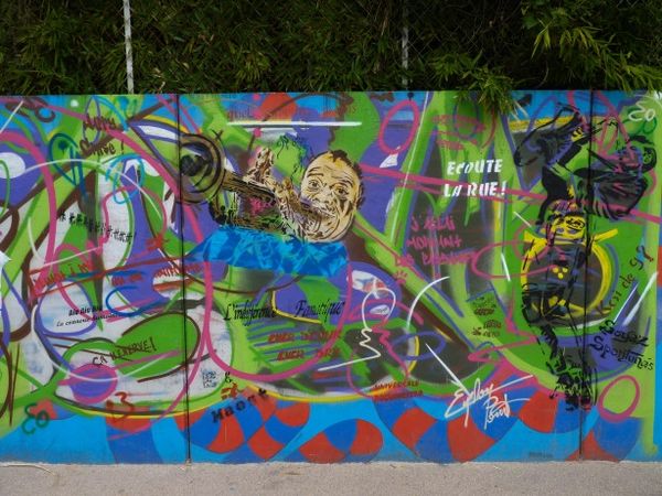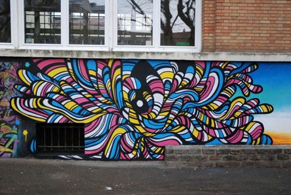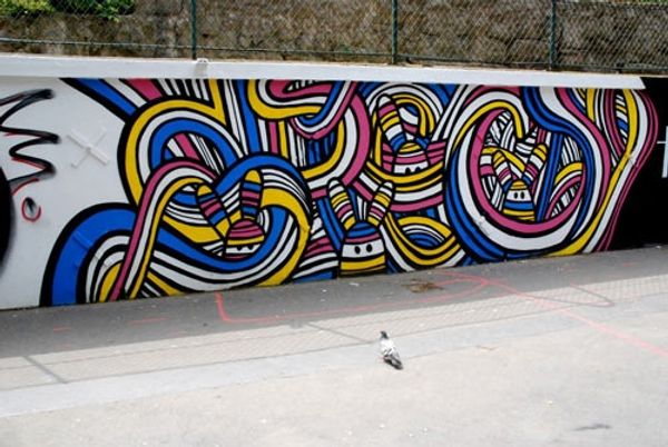 Speedy Graphito made this mural in Rio de Janeiro using bright colors and bold lines. It’s playful, like a party on a wall! The texture is raw, not trying to hide its spray-painted origins. Look closely, and you can see the layers, the drips – it's all part of the process. The colors pop: reds, pinks, and blacks dancing with turquoise, giving it this electric feel. Notice how the black and white stripes curve and bend. It almost feels like they're moving, right? It’s like the artist is riffing on pop art but making it his own. It reminds me of Keith Haring’s street art, but with a Latin American twist. It’s not just about what it represents, it’s about the energy, the vibe, and the conversation it sparks. Art doesn’t need to shout to be heard; sometimes, it just needs to groove.