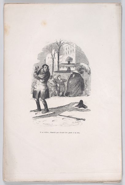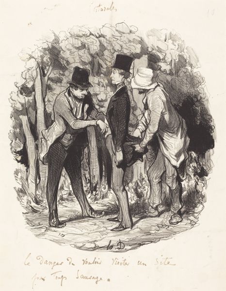 This lithograph, "Two Good Neighbors," was created by Honoré Daumier in France, portraying two men greeting each other over a garden wall. Their raised hats are gestures steeped in the iconography of bourgeois civility, yet there's an undercurrent, a latent tension. Consider the hat itself: In medieval times, the hat signified status and allegiance. Here, the raised hat is meant to denote respect, but also a desire to maintain social boundaries, a delicate dance of deference and defense. Think back to Renaissance paintings where similar gestures might signal piety or allegiance to a patron. But here, Daumier subverts this. The figures exchange a greeting, but observe their fixed smiles. Are they genuine? Or are they concealing a simmering animosity, the kind that festers in close quarters? The shared garden wall becomes a stage for this uneasy performance, a barrier between private worlds and public faces. The hats are raised, the smiles are offered, but the shadows of conflict lurk beneath. This is the eternal return of social etiquette, where outward harmony often masks the darker truths of human interaction.