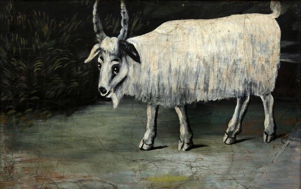 Curator: Here we have "The Sheep" by Niko Pirosmani, a work that strikes me immediately with its...starkness. Editor: It certainly has a direct, almost theatrical quality. The way the ram is presented, with the stark contrast against the black backdrop, it's as if we're seeing a stage portrait. What can you tell us about its construction? Curator: Well, this piece seems to be oil on canvas. Pirosmani was known for his unconventional methods. He frequently painted on oilcloth or metal, repurposing everyday materials that were readily available to him, reflecting the economic constraints he faced. Editor: So, resourcefulness driven by necessity? It's fascinating how limitations can influence an artist’s process. The very ground on which he worked— cheap materials, most likely— became part of the artistic statement. What about the reception of his work at the time? Curator: Pirosmani operated outside the formal art structures of his time, largely unacknowledged by the established art world. He primarily created signage for taverns and shops. His work became popular only after it was "discovered" by more established artists. We have to consider how museums and critics validated Pirosmani and constructed his public image long after the works were made. Editor: So the narrative of the "outsider artist" was strategically framed later to suit the evolving tastes of the mainstream. Back to the image. I'm particularly drawn to the rough, almost naive quality in his brushwork, and it underscores, for me, the connection to folk art traditions. Curator: Exactly! His deliberate choices speak volumes about challenging high and low art categories. He’s celebrating a particular labor— the making of signs. His art invites us to examine the complex relations between artistic production and the economic life. Editor: It really emphasizes how context shapes the artistic value, and invites us to reassess how we traditionally define art and the artist’s role in society. Curator: Agreed. "The Sheep" is a window into understanding Pirosmani’s engagement with materiality, labor, and value. Editor: Indeed. Seeing how this humble material carries such layers of cultural meaning is, to me, very impactful.