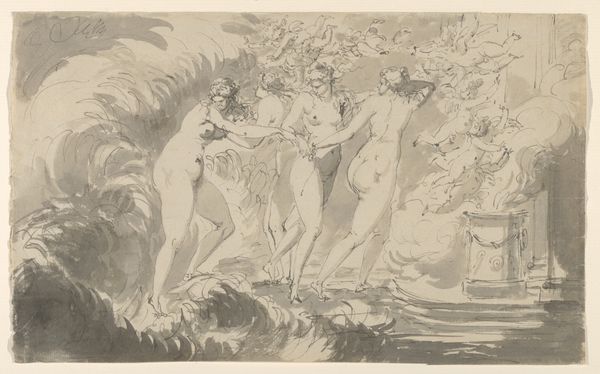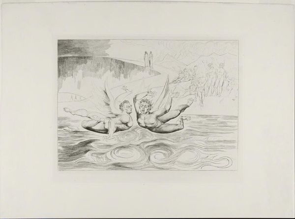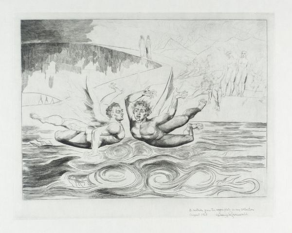 This is William Blake’s engraving, "The Circle of Corrupt Officials: The Devils Mauling Each Other." Made without a date, it presents a chaotic scene rendered through dense, wiry lines that convey torment and struggle. The composition is dramatically split between the earthly and the infernal. Above, two figures stand calmly on a precipice, while below, winged devils writhe in a tumultuous sea. Blake uses line and form to create a sense of swirling energy, emphasizing the chaos of the scene. The figures, contorted and anguished, are rendered with dynamic lines that highlight their muscular tension and emotional distress. Blake's work often critiques institutional corruption and moral decay, ideas that are visually communicated here through the mauling devils and the division of the composition. Blake invites us to contemplate the destructive forces of corruption and the pain it inflicts, a theme he conveys through expressive lines and a dynamic interplay of forms.