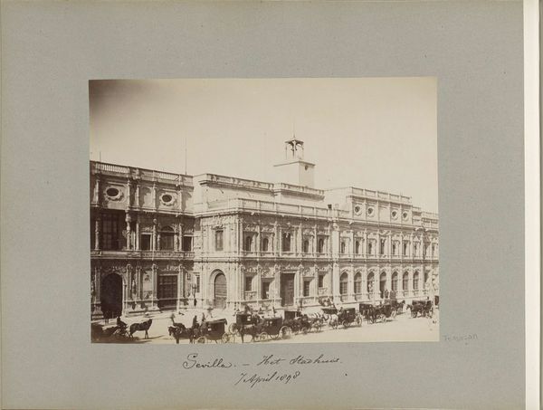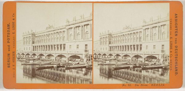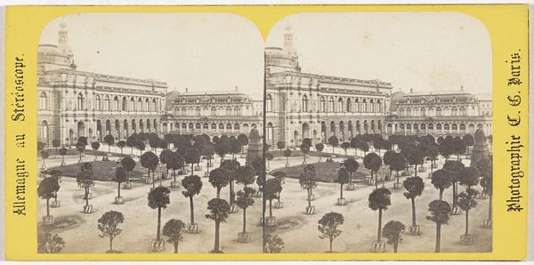 Curator: Good morning. We're standing before a stereo print by Hermann Selle, dating from about 1860 to 1880, showing the Neues Palais in Potsdam. Editor: It strikes me immediately as overwhelmingly formal and monumental, almost oppressively symmetrical. The muted sepia tones only amplify that feeling of austere grandeur. Curator: Indeed. The photographic format emphasizes depth, doesn’t it? Let's focus on the structure itself. See the repetitive patterns in the fenestration and the string course? Note also the rhythm established by the dome and smaller pavilions. The carefully placed trees offer a counterpoint to the architectural severity. Editor: Those dome shapes above, and the sculptures aligned at the top of the building also call to mind the sun, and even planets. Such iconography tends to symbolize absolute power and even divinity. This Neue Palais clearly embodies these concepts, likely a display of Prussian authority during that time. Curator: Precisely. The composition presents us with an exercise in axial symmetry; there's a mirroring of elements from left to right. It allows a very balanced viewing experience. Even the horizon is held firmly in place by the architectural mass. Editor: Yet this visual order perhaps attempts to contain the volatile sentiments arising as Prussia consolidated its empire. That relentless symmetry, almost robotic, becomes a way to regulate perceived threats from outside influences by constructing an external projection of national and internal "harmony". I cannot ignore that there are no figures present in this landscape... is this truly harmonic? Or simply static and oppressive? Curator: A compelling consideration of its impact on the human element, or lack thereof. Note too, the relationship between the interior and exterior volumes; the facades function almost as screens, offering depth and drawing your attention to receding planes within planes. Editor: Thank you. Observing such historical architecture always triggers associations for me around authority, order and sometimes stifling societal regulation... But of course the sun is always just a symbol in itself -- there are shadows in every visual or symbolic harmony we find in the Neues Palais or other displays of "power". Curator: An important distinction, especially as we view it through a contemporary lens. It underlines, as always, the power of seeing, examining and contextualizing historical imagery from every possible viewpoint!
