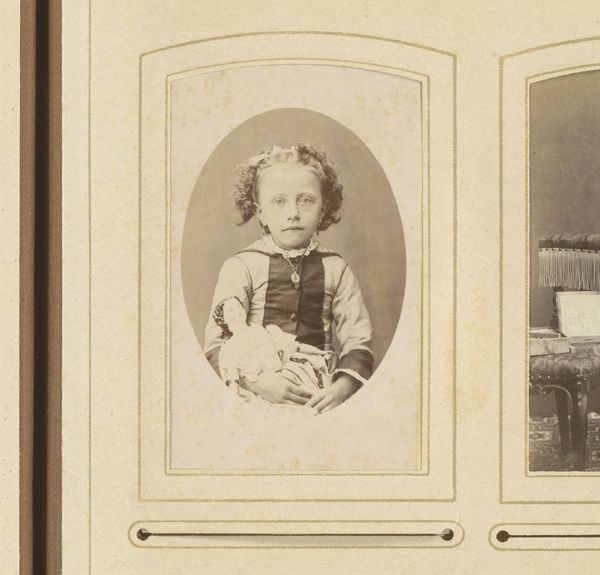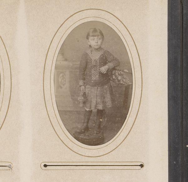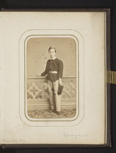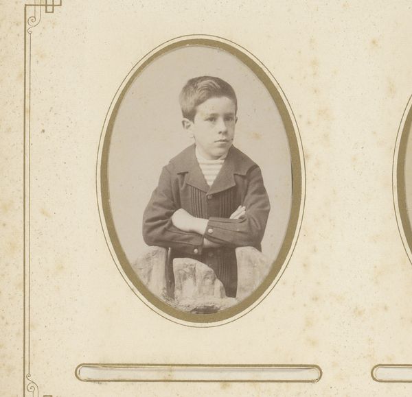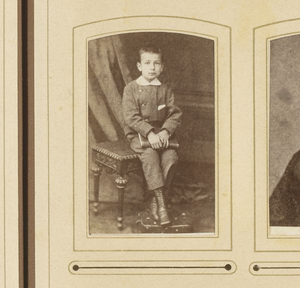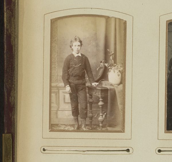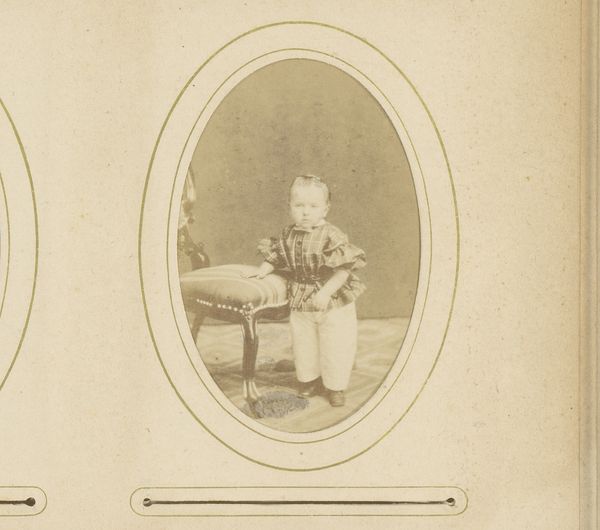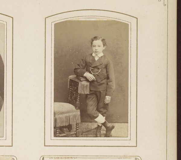 This is a portrait photograph of a boy standing by a chair, made by Gerrit Dirk Siewers. The sepia tone of the photograph and the formal posture of the boy create a somber and subdued atmosphere. The composition is structured around the interplay of verticals and horizontals: the straight back of the chair, the boy's upright stance, and the rectangular format of the photograph itself. These rigid lines contrast with the softer elements, such as the gentle curve of the chair's cushion and the delicate fringe, creating a visual tension. Consider how Siewers uses the formal elements to convey a sense of the subject's social standing and perhaps also a psychological state. The limited tonal range further emphasizes the sitter's stoicism. The photograph operates within a cultural framework that values decorum and restraint. However, through its subtle contrasts and carefully constructed composition, Siewers challenges a singular interpretation, inviting us to consider the complexities of representation and identity.