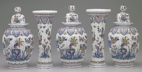 Curator: Well, hello there. Look at this collection; there's something almost dreamlike about these pieces. They're like delicate clouds of color solidified into earthenware. Editor: Dreamlike, yes, but perhaps more like a carefully constructed dream, wouldn’t you say? This is an assemblage of Baroque-style vases, crafted around 1710. The symmetry is striking and yet, at the same time, so regulated. Curator: I see what you mean, controlled in its expression, but within the control, there’s so much intricate detail. I’m drawn to the floral motifs that seem to cascade across the ceramic surfaces; they whisper of spring mornings. They feel really optimistic somehow, very life-affirming. Editor: Indeed, these vases are exemplary of Baroque decorative art, and were never conceived merely as containers. These vases functioned as dynastic displays and were made for elites with ties to global trade networks, because ceramics like these signalled global taste, wealth, and, above all, access. The ornamentation of nature disguises global access through botanical form. Curator: That shifts the picture! Suddenly, it's not just decorative. I think these kinds of domestic, handcrafted artworks can easily get a rep as fussy or even silly, but there's some coded colonial language at work. This puts a new perspective on it for me. Editor: Absolutely. And if we think about where these earthenwares might have sat within a Baroque interior, then we can begin to understand the dynamics of visibility. Consider the ways such precious things, and who got to see them, dictated societal parameters for recognition and who belongs and who is omitted. Curator: Thinking about the "who" gets to view makes it so different from considering simply what gets viewed. Okay, now it's taken on this sense of drama; a hushed room with a small elite admiring a table with these pieces; like witnesses at the play! I like that reframing a lot! Editor: That’s what is so crucial when understanding art. Context makes a piece legible. Once we're given that key, a silent vase starts to talk, doesn't it? Curator: It truly does. Thanks for this enlightening conversation about ceramics that really gets the flowers… or vases blooming! Editor: Yes, context lets us dig beneath decorative art to locate new forms of appreciation.