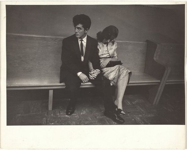 Editor: So, this gelatin-silver print, "Mary and Dan Solomon" by Arnold Newman, dates from 1989. I'm struck by the formality and the considered composition, even down to the textural differences between their outfits. What aspects draw your eye, considering how Newman might have conceived of the final product? Curator: Given Newman's position within photographic portraiture, and my focus on material production, I consider this work through the lens of labour. The gelatin-silver print process itself involves a complex choreography of labor, from the manufacturing of the materials to the photographer's craft and darkroom techniques. This couple's portrait, presented in high-contrast monochrome, uses the very trappings of corporate presentation – suits, formal poses - to subtly challenge what we assume to be a clear, unbiased representation of success. Do you think the material and method serve to celebrate or perhaps subtly critique their social standing? Editor: That's a perspective I hadn't fully considered. Perhaps the choice of gelatin-silver, with its inherent archival qualities, implies a desire for permanence and reinforces the power structure, even if there is room to interpret this as subtle criticism. Does the backdrop itself have meaning or significance for you? Curator: Absolutely. It appears constructed, almost like a minimalist stage set. The use of contrasting tones isolates the Solomons, directing focus towards them and underscoring the deliberate fabrication of the image. The manipulation of light, the carefully chosen clothing, even the couple’s arrangement, all point towards Newman’s labour as an artist. The act of image construction emphasizes wealth and position and invites scrutiny of how these ideas were produced. Editor: I appreciate how you've highlighted the materiality and labor interwoven into what initially appeared to be a straightforward portrait. I’ll never look at this photo in quite the same way. Curator: And I found your thoughts about permanence in the process, pointing to power structures, very useful and perceptive.