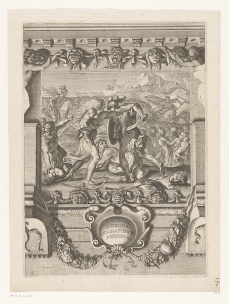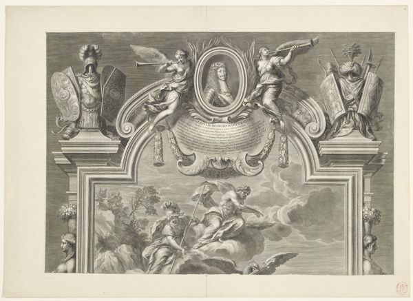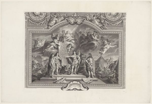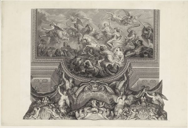 Nicolas Gabriel Dupuis created this print of the ceiling painting in the Grande Galerie of Versailles. The printmaking process, using metal plates to reproduce an image, allowed for the wide distribution of royal propaganda. Consider the sharp lines and contrasts achieved through the engraving process, a testament to the engraver's skill. The texture and weight of the paper support the detailed imagery, bringing Louis XIV and his world of mythological figures closer to the masses. This was not just an artistic endeavor but a strategic act of cultural dissemination. The print captures the opulence of Versailles, reflecting the era’s intense labor and resource extraction. The palace itself was a massive undertaking, symbolizing power through extravagant consumption and artistic production. By focusing on the material and method of its making, we see how art served the ambitions of royalty, blurring the lines between craft, fine art, and political messaging.