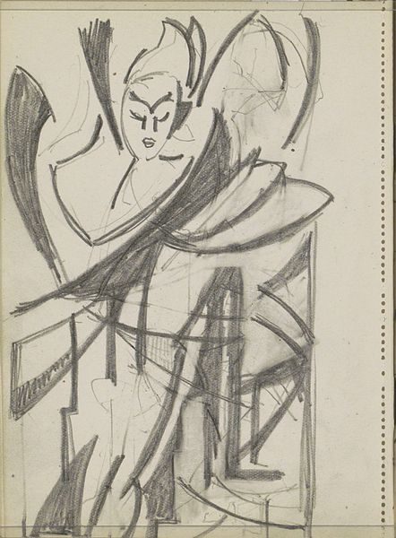 Editor: Here we have Kazimir Malevich's "Mähende Frau (Zhnitsa) Vorgebunden zu_ Vozropshchem, St. Petersburg 1913," a drawing with graphite and pencil from 1913. I find the geometric forms layered to create the figure fascinating, almost like a machine woman. What do you make of it? Curator: The interesting element to consider here is the intersection of peasant labor with the aesthetics of the machine age, particularly as presented in Cubo-Futurism. What implications arise when rural agricultural labor is rendered through geometric abstraction, almost like the cogs of a machine? It challenges traditional romantic views of peasantry. The lithographic reproduction methods would have been available, so thinking about production methods: how accessible or exclusive would an image like this have been? Editor: I didn’t think about that... so the way Malevich constructed this peasant woman suggests this almost robotic element through abstraction that removes the idealised rural scene. So, instead of celebrating it he transforms it to mirror an industrialized world? Curator: Exactly. We are prompted to consider the work process, as it transforms the peasant figure into abstracted and machine-like. It certainly asks a broader question of how artistic representation affects perceptions and ultimately the societal conditions of labour. Editor: So, understanding how he used materials like pencil and graphite reveals a message beyond the aesthetic surface and shows how art plays into the societal landscape of labor and even early capitalism. It really makes me think about how even art can either reproduce or disrupt these traditional portrayals. Curator: Precisely. And this type of art certainly provokes more engagement with societal implications than just appreciation.