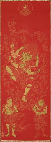Curator: Initially, I'm drawn to the overall visual effect. The stark black lines carved against that warm orange background creates a fascinating textural interplay. Editor: And that immediacy hints at its woodcut process. We are looking at "After an Iran Sculpture" created by John Bernhardt in 1956. Given the title, I am led to believe Bernhardt likely found some interesting sculptures he then wanted to turn into print form using abstraction. I wonder about the specific labor involved in transferring the observed object into wood and then printing it. Curator: That title provides a point of departure. Though abstracted, there’s a distinct feeling of the monumental, even in this two-dimensional representation. Observe how the interplay of positive and negative space dictates the visual flow. Editor: It's about accessibility as well, right? Woodcuts have been a more accessible art form, reproducible and transportable, unlike the original sculpture that demanded significant material, place, and specialized labour. The choice of material—wood— itself suggests the history of this accessible and perhaps reproducible nature. Curator: Material properties influence form and reception, indeed. Wood's grain and density resist precision, thus influencing Bernhardt's mark-making; but consider also that a form such as this encourages viewers to project and complete forms, to question the stability of representation. The shapes hint at familiar forms but defy complete identification. Editor: Absolutely, and even the way the image will vary, each print differing in how the ink is applied and taken away adds another layer of individuality to these accessible pieces. What strikes you about Bernhardt’s approach to mark making? Curator: The dynamism of the lines. He moves from hatching to block-like shapes to the sweeping curves suggesting movement. His visual grammar keeps the viewer moving. Editor: For me, that constant shifting speaks to the constant processes and pressures on artistic traditions from "high art" to reproducible image that a print like this raises, the tension between concept and the hands involved in this creative expression. It really prompts thoughts around both the transformation and preservation of imagery. Curator: A pertinent reflection, highlighting how visual culture circulates, changes, and ultimately preserves or reinterprets legacies. Editor: Definitely a journey in method as much as visual appreciation for that source sculpture.