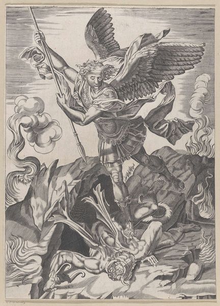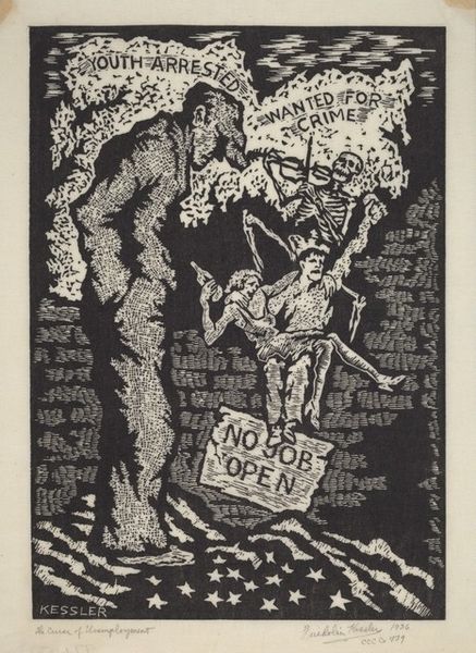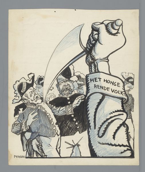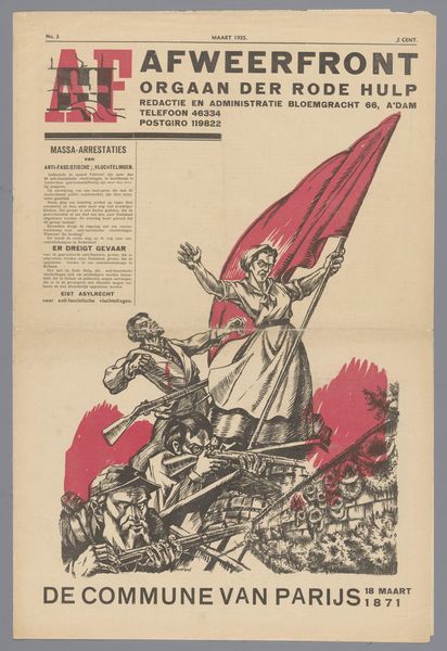Editor: This arresting poster, “Affiche tegen militarisme uitgegeven door het Nationale Arbeiders Secretariaat in Nederland,” created sometime between 1918 and 1925 by Elias Smalhout, employs bold graphics and stark imagery. I’m struck by the nightmarish figures and how they represent militarism. How should we interpret this potent anti-war statement through the lens of its time? Curator: Indeed. We should consider the socio-political context. This poster emerged in the wake of World War I, a conflict that shattered previous notions of progress and exposed the brutal realities of industrial warfare. Given the Dutch National Labour Secretariat's backing, how does the artwork reflect the broader socialist critique of militarism as a tool of capitalist oppression? Editor: I see the armored figures representing war. The skeleton on the flag is terrifying, too, so I guess that that answers my previous questions. Curator: Precisely. Symbolism plays a crucial role here. Note the caricature of authority figures juxtaposed with the idealized worker. The "compulsory physical exercise" mentioned translates to militaristic indoctrination. To what extent does this poster capture a sense of widespread disillusionment and anxieties about the future of Europe in the interwar period? Editor: I hadn't thought of the physical exercise as a criticism of militaristic indoctrination. That helps unlock the meaning of the whole poster! Thank you for clarifying its symbolism. Curator: These kinds of pieces invite us to consider the public role of art in shaping political consciousness and mobilizing social movements during times of conflict and social change. Editor: Absolutely. It’s amazing how deeply historical context can influence our interpretation of even the most seemingly straightforward images. Curator: I agree, reflecting on this work shows the potency of visual language as a form of historical resistance.