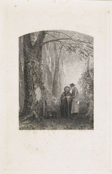 Curator: What a tender moment captured in this drawing! It’s titled "Paar wandelt in het bos"—A Couple Walking in the Woods—and was rendered by Willem (I) Steelink sometime between 1836 and 1906, using pen and pencil. Editor: It strikes me as both intimate and a little melancholy. The subdued palette emphasizes a quiet connection amidst the forest. Look how the lines delicately form the figures and their gentle embrace. Curator: Exactly! Steelink's use of pen and pencil gives the piece a certain softness. The details, though faint, suggest a story. Perhaps a quiet, reflective walk where words are unnecessary. The shading also masterfully builds the forest as this serene, sheltering entity. Editor: Observe how the structural components such as the trees are built to point toward the couple. Semiotically, the density of the woods enclosing them indicates themes of enclosure, privacy, and a retreat from the world, emphasizing their unity. Curator: Yes, there’s a romantic idealism there, a yearning for harmony, typical of landscape-oriented Romanticism. I imagine Steelink pausing to capture this simple, pure interaction, seeing the natural world mirror the figures' sentiments, just like his contemporaries. Editor: And note how their clothes and basket fit naturally within a landscape—with lines following the vertical lines of the tree trunks. This use of contour integration creates depth, which visually guides the eye through the woodland. Curator: Perhaps this is Steelink inviting us to consider our place within nature, just as this couple does, linked together! To reflect, pause, appreciate the understated joys of being connected to each other, and to the natural world. Editor: I appreciate how we, as the viewer, feel the closeness while interpreting how that union mirrors our own relation to pictorial elements in the work itself, prompting reflection beyond a surface reading.