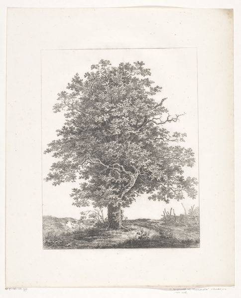 Editor: This is "Two Trees Before a Fence," an etching by Adrianus van der Koogh, dating to about 1826, here in the Rijksmuseum. The fine lines create a serene and calming effect. What do you see in this piece that might not be immediately apparent? Curator: Beyond the trees themselves, I see a symbolic dialogue between nature and human order. The fence acts as a boundary, a claim of ownership, but the trees, with their unruly branches and deep roots, predate and will outlast it. It reminds us that the natural world exists independently of our constructs. How do you feel about the relationship of humans and nature here? Editor: I guess I hadn't considered the fence as being anything more than, well, a fence! I can definitely see now how it’s there to frame the untamed character of nature and act as that divider. But that makes me wonder, does the artist favor one side over the other? Curator: Perhaps. Look at how the light plays across the foliage, imbuing the trees with a certain vitality, compared to the static linearity of the fence. But there’s a tenderness in how the fence is rendered too. It suggests coexistence, a kind of negotiated space. How interesting that they chose this place for it... Is the broken stump important, perhaps hinting to a passing of old growth or old ways? Editor: That's really interesting to consider - it wasn't necessarily just about painting the prettiest landscape possible, and to look beyond the obvious representation. The fence and tree stump contribute to a whole, complex narrative. I definitely appreciate this more now! Curator: Indeed! Visual art allows us to continually excavate these deeper layers of meaning that shape our understanding of the world.
