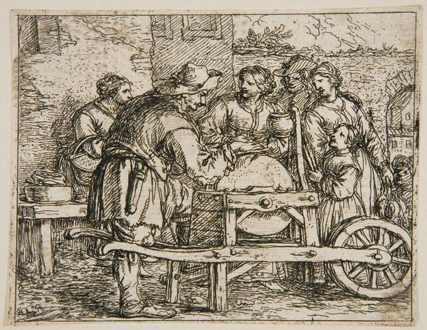 Curator: Sebald Beham's print, "Prodigal Son Wasting his Fortune," really jumps out, doesn’t it? Though diminutive in scale at roughly 5 by 9 cm, it packs quite a visual punch. Editor: It’s striking how he manages to convey a sense of debauchery, all within this tiny rectangle. The figures, clustered and conspiratorial, evoke a feeling of moral decay. Curator: Absolutely. Beham uses the visual language of the prodigal son narrative to explore themes of excess and moral downfall, which are recurring motifs during the Renaissance. Editor: The garden setting, seemingly idyllic, becomes a symbolic space for reckless abandon. Note the way the figures are entwined, a stark contrast to traditional family depictions. Curator: Right. Beham is subverting those family expectations, suggesting that the prodigal son is choosing momentary pleasures over his responsibilities. The tilted horizon makes me feel unsettled. Editor: It's a potent reminder that such choices carry consequences. It all feels so relevant today. Curator: I agree. It offers a glimpse into the complexities of human nature, even when we're talking about an artist who worked over 500 years ago.