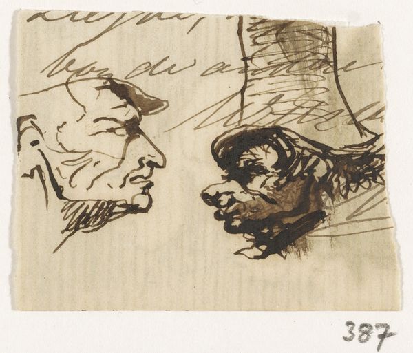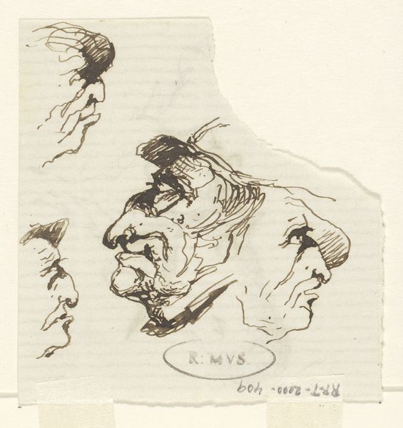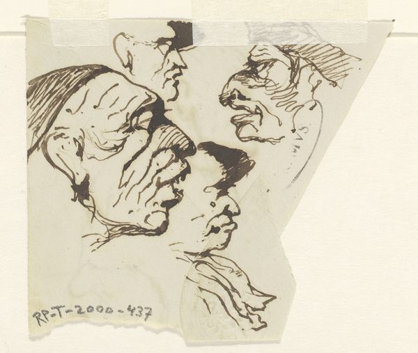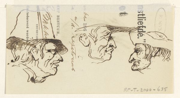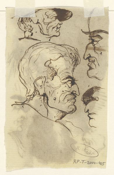 Editor: This ink drawing, "Koppen," created by Johannes Tavenraat sometime between 1840 and 1880, features multiple head sketches. There's something almost frenetic about the linework. What do you see in the way Tavenraat worked with these materials? Curator: Well, let's consider the choice of ink and paper at this time. Mass production of paper was becoming more prevalent, affecting the accessibility of art materials. This drawing offers a glimpse into the artist's studio practice and material constraints. Are these studies for a larger work, or ends in themselves? The economic realities inform the rapid, seemingly casual approach. Editor: So, you're saying the very affordability and accessibility of ink and paper at the time might have influenced his style? Curator: Exactly. Ink wash lends itself to quick studies and exploration of form, suggesting a workshop context, maybe? Was this a preliminary investigation where multiple heads develop possible future work? How might access to materials like this empower emerging artists? Editor: It's interesting to think about how the materials themselves influenced not only the technique but also the purpose of the artwork. I hadn't considered that. Curator: Considering the relationship between material, labor, and artistic intention gives us a richer appreciation. What do you make of the relationship to Romanticism? Are these idealised heads, or naturalistic depictions of real working class faces, a burgeoning area of research? Editor: That helps me understand it better, looking beyond just the image itself to the context of its creation and use. Thanks! Curator: Precisely. Examining the social and material conditions allows for a greater understanding.