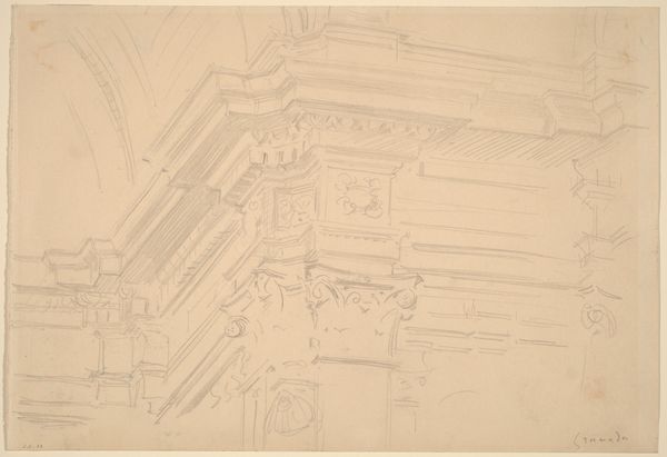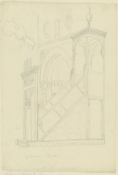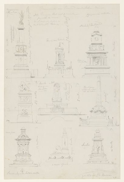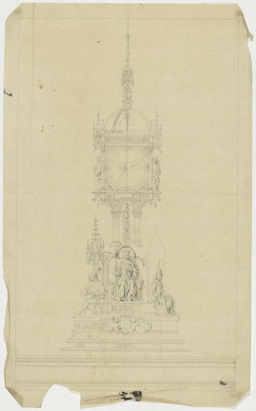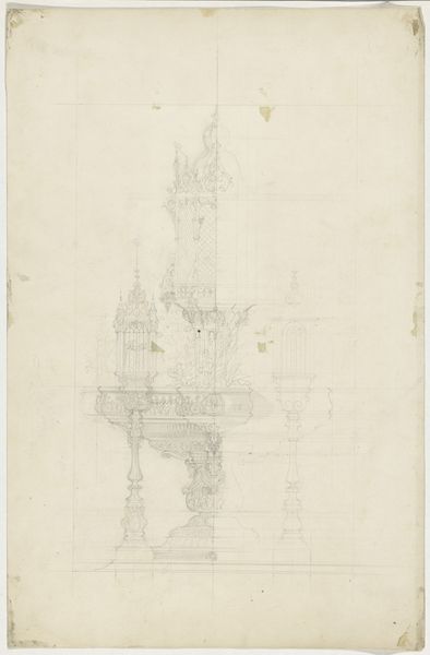 Editor: Here we have "Reliekhouder," or "Relic Holder," a pencil, etching, and drawing on paper, created around 1830-1850 by Firma Feuchère. The wispy lines give it an ephemeral quality, like a memory. It’s hard to tell what it looked like. What stands out to you when you see it? Curator: This skeletal structure is interesting precisely because of its incompleteness. What relics were meant to be housed here? It seems to draw on a deep cultural well, mixing Christian reliquaries with perhaps something more secular, a celebration of lineage or national heroes. The symbolic language, though faded, feels intentional. Do you get a sense of what this could signify? Editor: It looks like a medieval cathedral, maybe something that would hold a saint's bones? There’s something imposing, but also delicate about it. Like a dream about power and religion. Curator: Exactly! It's reaching for something grand and perhaps unattainable. Think of the relic as a fragment, a tangible connection to a powerful idea. This "Reliekhouder" becomes more than just architecture; it's an attempt to hold onto memory, faith, or historical narrative, perhaps even invent one. The hazy nature reflects its intended purpose: not exact duplication but evocative sentimentality. Editor: That’s so fascinating. I initially saw it as incomplete, but it's holding so many potential meanings! Curator: It asks us to participate in its completion, doesn't it? What feelings did relics in churches arouse? Does this relate to feelings connected with keepsakes in your home? How might architectural designs inspire strong emotional, even spiritual feeling? Editor: It gives you the emotional feeling without telling you exactly what it should be. Thanks for that! It changes how I look at not only this sketch but anything religious now. Curator: Absolutely! Every line, even those lightly sketched, carries the weight of cultural memory, waiting to be decoded.
