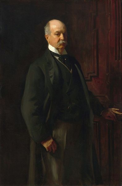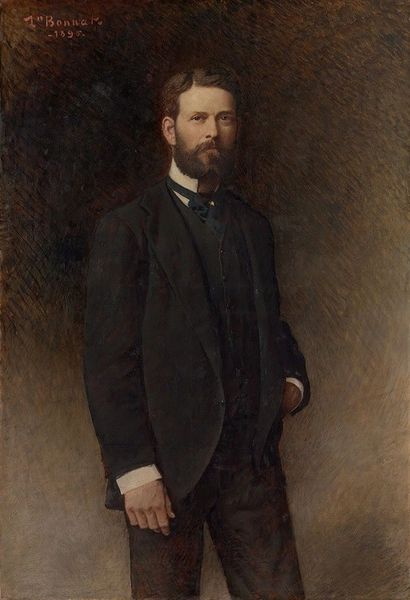 Curator: Emil Fuchs painted this portrait of Sir Joseph Duveen, a prominent art dealer, sometime between 1866 and 1909. Editor: He looks...imposing. That handlebar mustache alone exudes an almost theatrical confidence. Curator: Indeed. The pose, with hand tucked into his coat, mirrors traditional portrayals of power and authority. Even the sculpture in the upper corner suggests his world of fine art and collecting. Editor: It's all so wonderfully controlled, isn't it? The muted tones, the deliberate composition…it hints at the calculated presentation of self. One wonders what he was really like. Curator: Consider how the muted colors draw attention to his face, making him seem more real and less of an ideal. The overall effect is the construction of an identity of class, wealth and importance. Editor: Yes, the artist seems to have found the perfect visual language for such a figure. It’s a fascinating study in how we project ourselves. Curator: A portrait frozen in time, yet still, so much to analyze and interpret, don't you think? Editor: Absolutely. It gives you much to ponder.