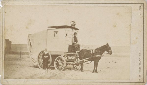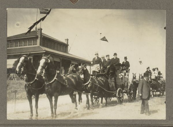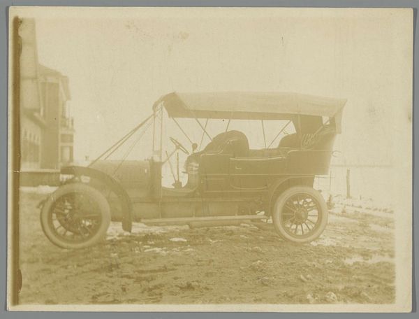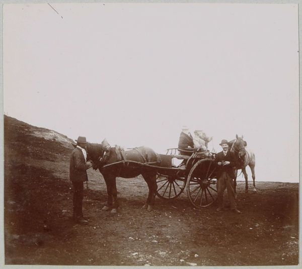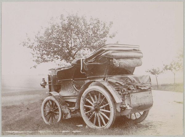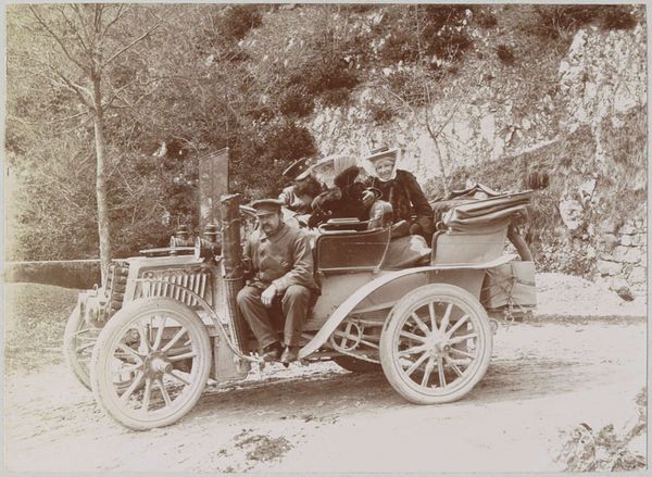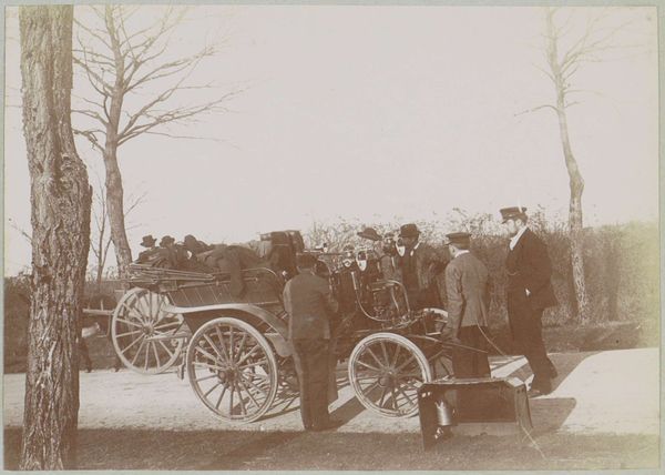 Editor: We're looking at a vintage photograph, "Gezelschap bij twee automobielen in Frankrijk, waarschijnlijk tijdens een race voor Mors-automobielen," taken around 1898. It's an albumen print from the Rijksmuseum collection, portraying two early automobiles and a group of people. I'm struck by the contrast between the mechanical forms and the organic backdrop of trees. What do you make of its composition? Curator: Structurally, the photograph employs a relatively shallow depth of field, focusing our attention on the vehicles and figures while softening the background. Note the placement of the automobiles, arranged almost as if in a formal portrait. The lines of the road subtly draw the eye towards the background but the tonal range of the albumen print lends a unified surface quality, where the darker browns are evenly distributed to anchor the image. Editor: So, the arrangement itself, the choice of what to put where, is key to its meaning? Curator: Precisely. Observe how the circularity of the wheels is echoed in the curves of the carriage body, suggesting a formal dialogue between design elements. Moreover, the arrangement of figures invites an interplay of gazes; are they admiring the machines, posing for the camera, or simply conversing? The question is left visually unanswered. How does this photograph reflect the shift towards modernity? Editor: I see what you mean; it's like the dawn of a new era frozen in a very deliberate pose. The composition guides my eye, allowing me to almost hear the engines. I hadn't considered how much the form contributed to that feeling! Curator: Indeed. It reveals that the composition and treatment of tone gives a sense of that very moment that the industrial age emerges. It's an interesting effect, almost poetic.